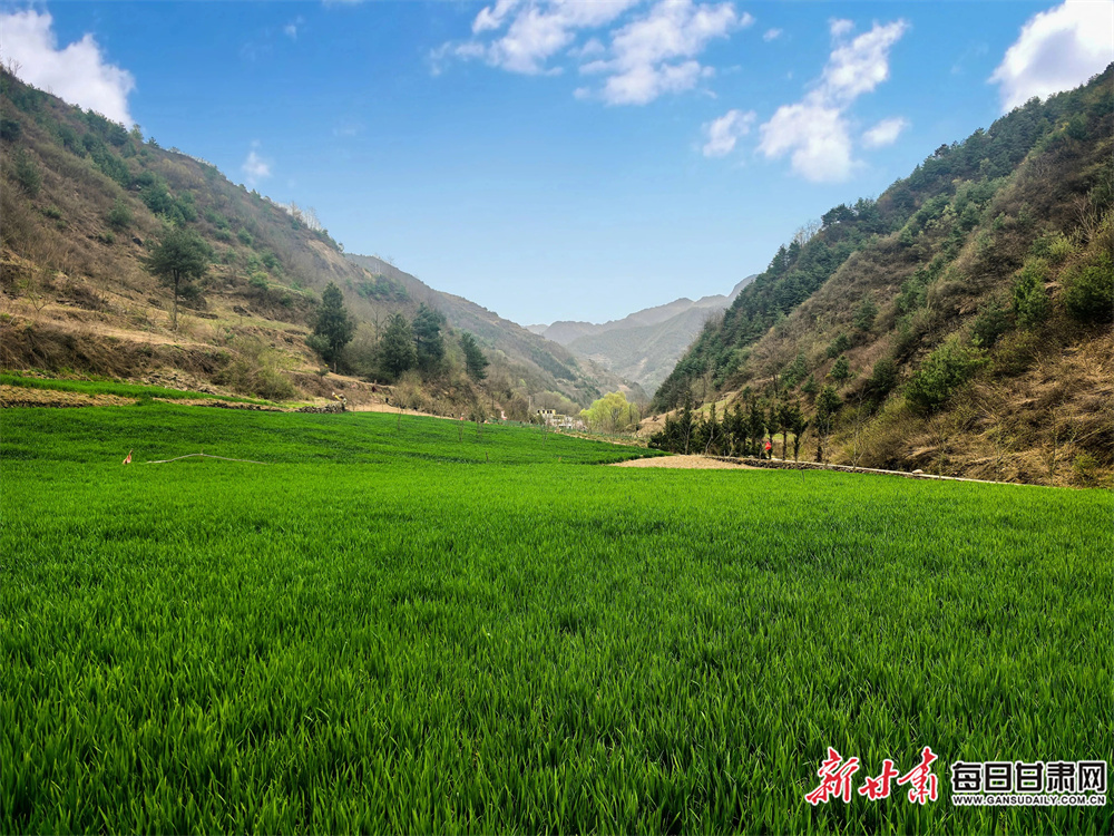 极目远眺,广袤田野上新绿的麦苗随风轻舞,翻涌成浪,奏响生命的蓬勃乐章。巍峨群山环绕四周,与湛蓝如洗的天空相映成趣,几朵白云悠然飘荡,恰似点缀在天幕上的柔软棉花糖。这里没有喧嚣纷扰,唯有纯粹的自然之美,令人沉醉。