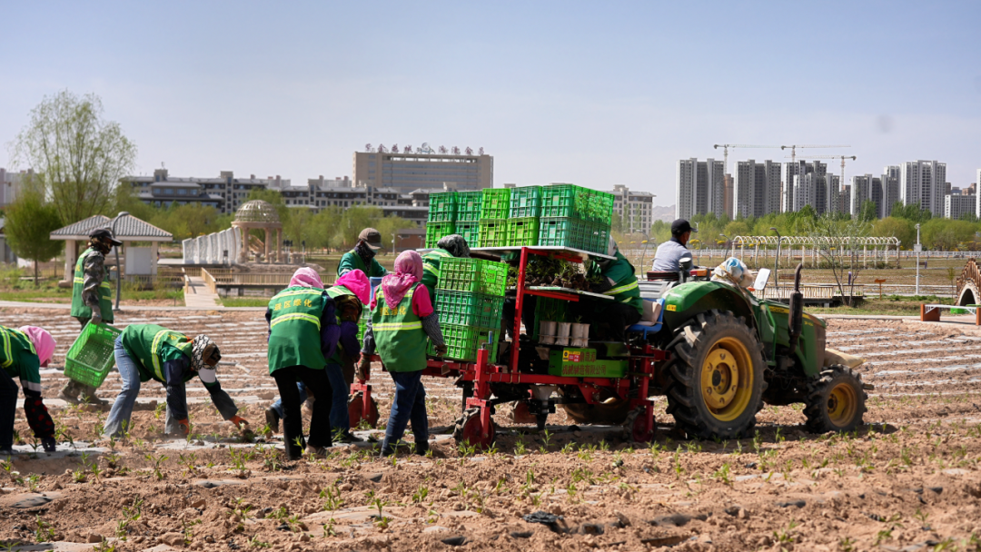 4月28日,记者在金昌紫金苑景区看到,近百名工人与智能化机械协同作业,有序推进花卉种植工程。