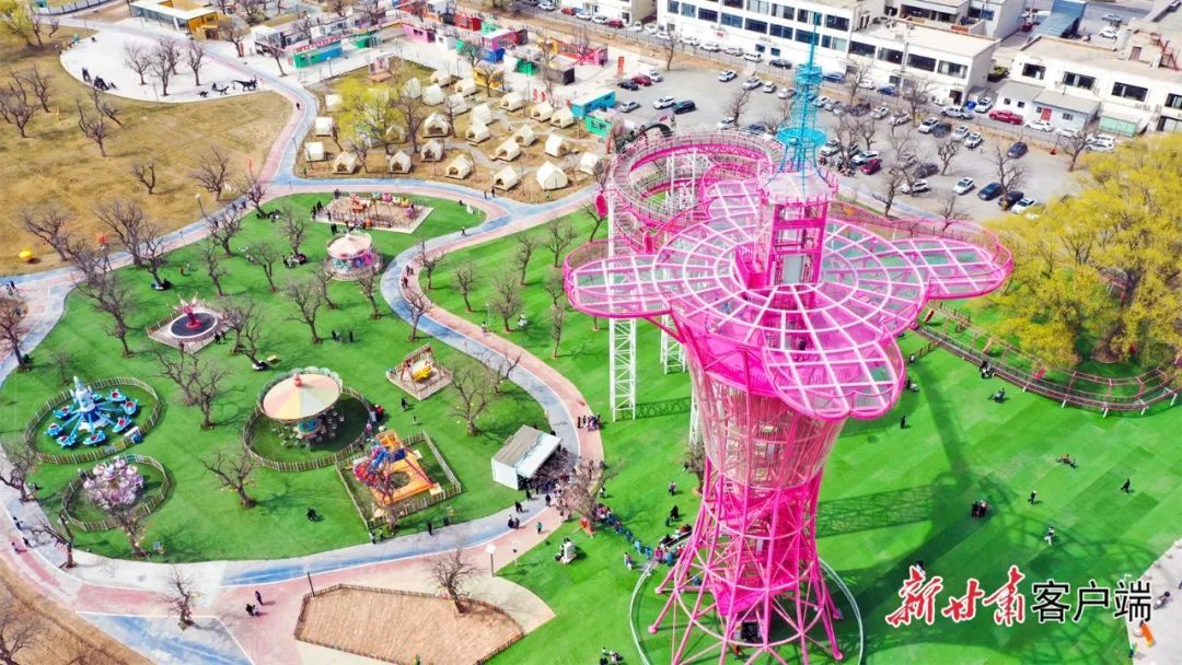 黄河三湾景区碧水如镜,沿岸杨柳吐翠,露营帐篷点缀于绿意盎然的河畔,粼粼波光与远山相映成趣。孩子们在滑梯、蹦床、独木桥等设施间嬉戏玩耍,欢声笑语不断,构成一幅动人的春日图景。
