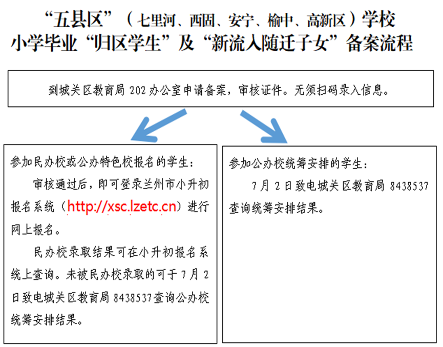 其中,归区、新流入的五县区(七里河、西固、安宁、榆中、高新区)学生,可以到城关区教育局202办公室申请备案,审核证件,无须扫码录入信息。办理了“归区”或“新流入”手续后,如参加民办校招生,只能报民办学校第二志愿。未能被民办校录取的学生,将会根据学位空缺情况被统筹安排到城关区公办学校入学,不能再回到毕业学校所在县区入学。