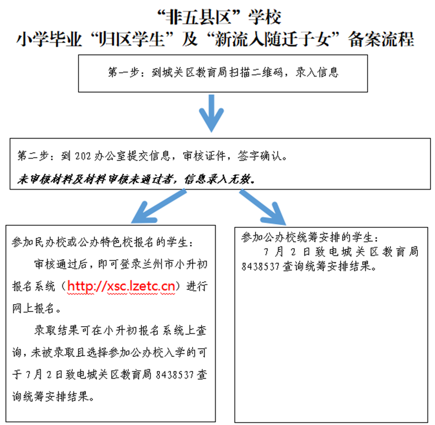 其中,归区、新流入的非五县区学生可以到城关区教育局扫描信息录入码,录入学生个人信息,先不用提交,然后到教育局202办公室申请备案,审核证件,审核通过后再确认提交录入的个人信息。办理了“归区”或“新流入”手续后,如参加民办校招生,只能报民办学校第二志愿。备案时,如未勾选“如未被民办校或外语类、体艺等特色学校录取是否参加公办校划拨”的“是”选项,我区将不再安排该生到城关区公办学校入学。