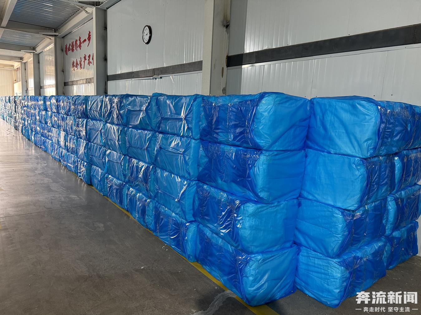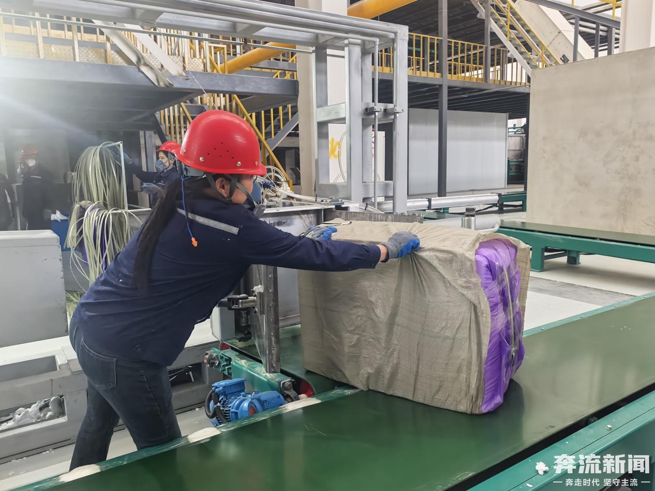 5月12日开工投产的离心棉生产车间,蓝、红、紫、绿等不同颜色包装的不同型号纤维棉通过传送带运往堆货区。夏春雷介绍,离心棉的生产工艺和火焰棉最大的区别是,离心棉是将玻璃块经电加热融化窖炉后离心成纤,这种新技术产出的纤维棉造价更低,主要销往江浙、山东、贵州等地区。