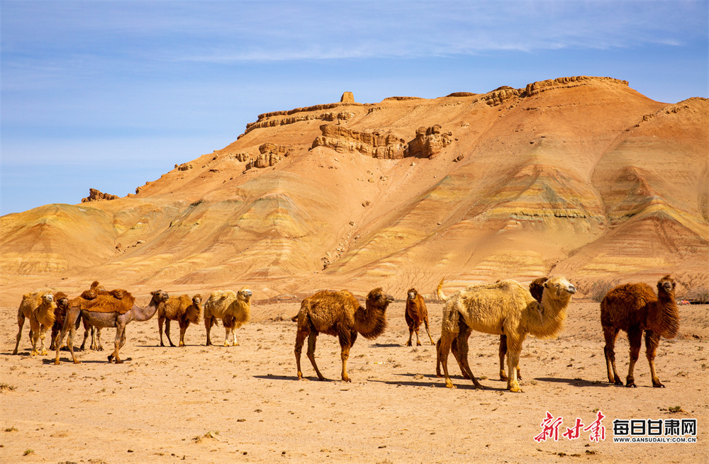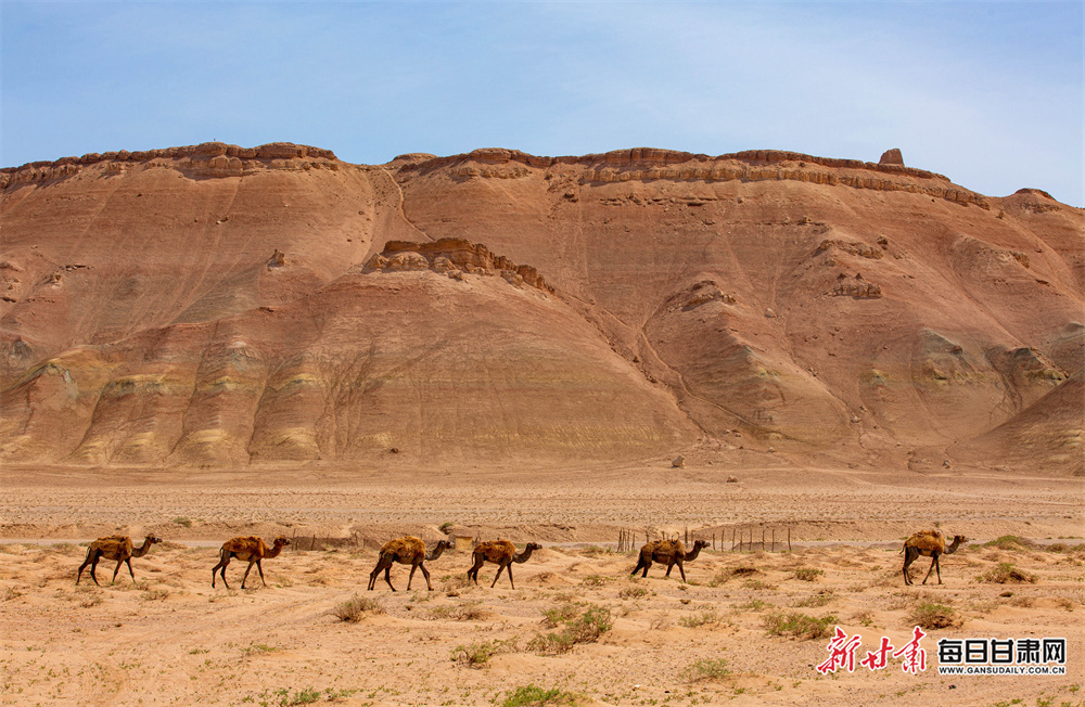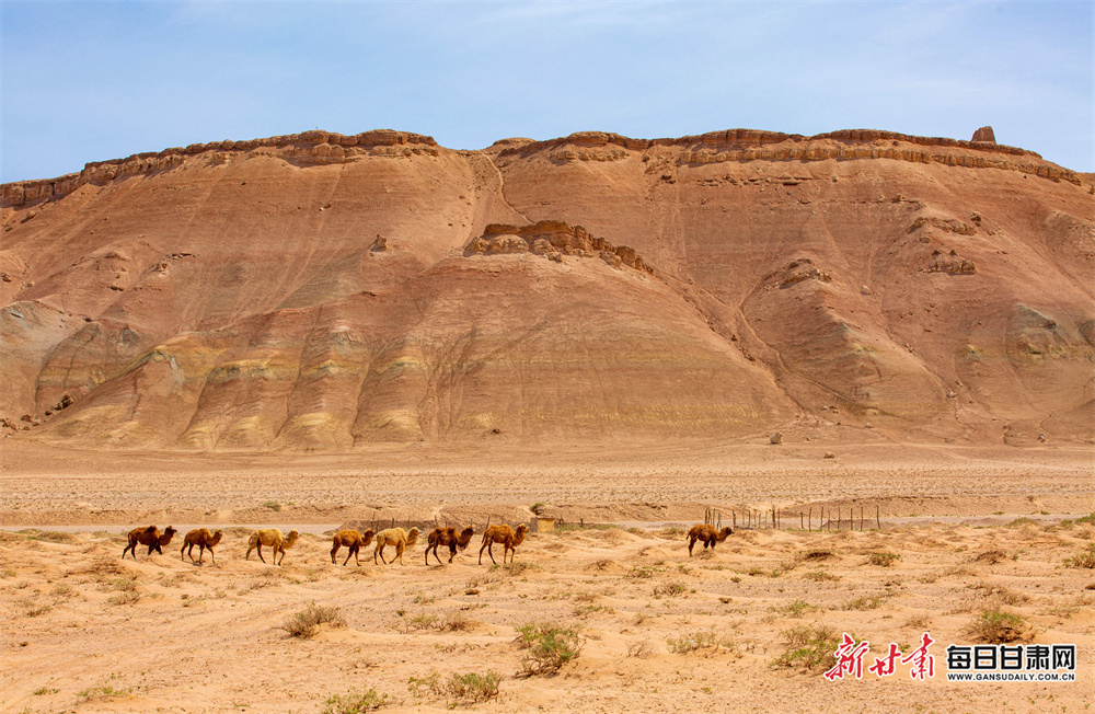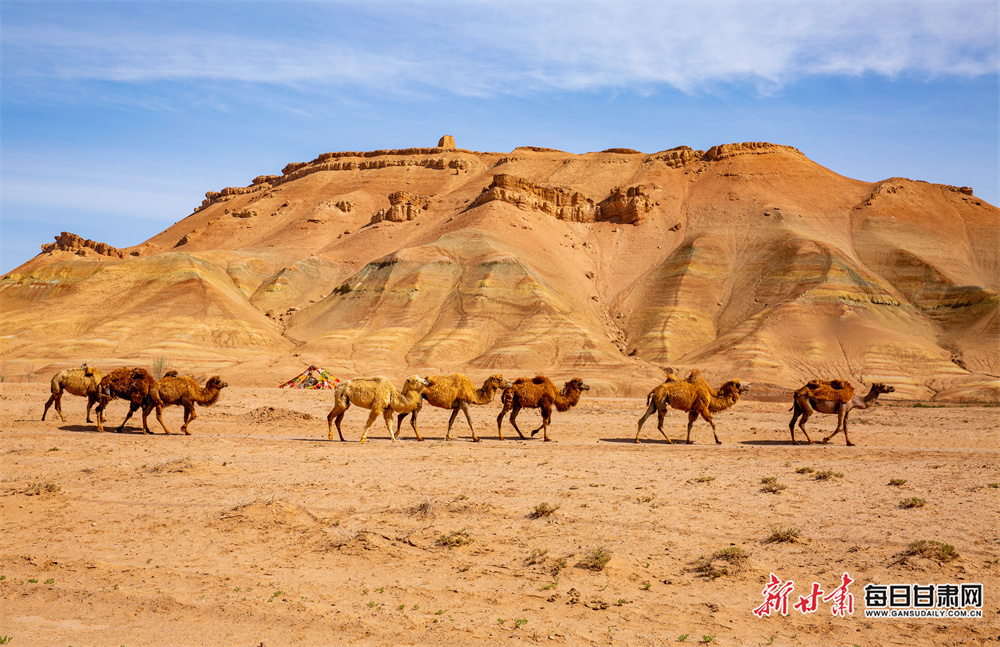 5月14日,在蜿蜒千年的丝路古道上,张掖市临泽县羊台山呈现出一幅雄浑壮美的塞外画卷。成群的骆驼正悠然踱步,驼铃轻响,在广袤的天地间绵延成流动的曲线;古朴的羊台古塞与斑驳的长城烽燧静静伫立,历经岁月沧桑,却依然以巍峨之姿诉说着往昔的金戈铁马;澄澈如洗的蓝天之下,朵朵白云随风舒展,与大地的苍茫色调相映成趣。