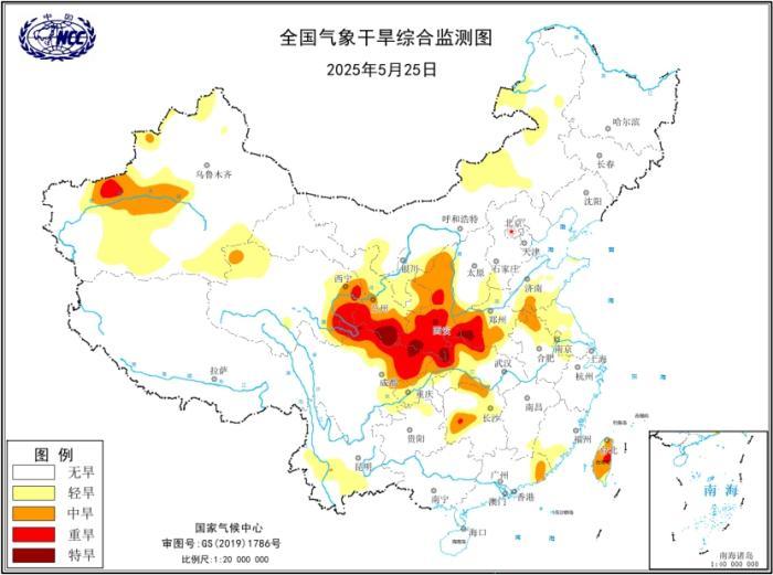 中新网5月25日电 据中央气象台网站消息,中央气象台5月25日18时继续发布气象干旱黄色预警,据实时气象干旱监测,陕西、河南、甘肃等省份存在重度及以上气象干旱,局地特旱。预计,未来3天,旱区大部有小到中雨,甘肃南部、陕西西南部等地有大雨,有利旱情缓和,但由于降水分布不均匀,部分地区气象干旱仍将维持。