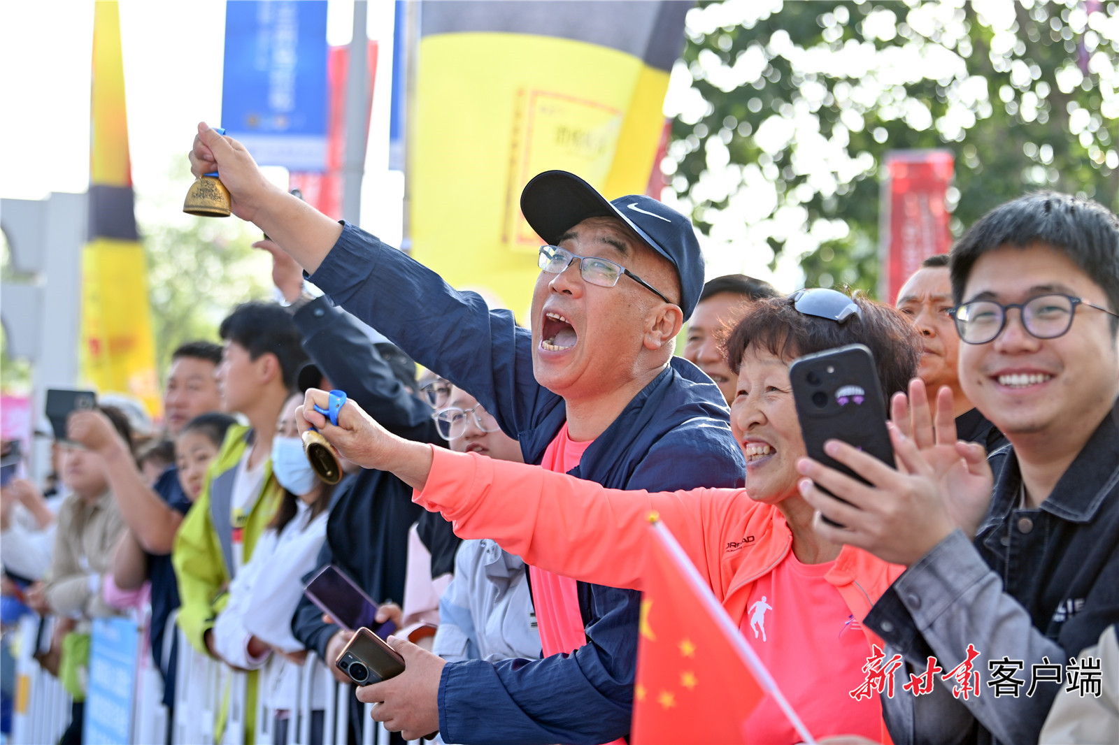 发令枪响,参赛者如潮水般涌出,沿着百里黄河风情线开启征程。赛道边,热情的兰州市民和游客组成了强大的助威团,259名领嗨员带领大家高喊口号,35个惊喜点位发放的加油道具,让助威声此起彼伏。在黄河母亲路段,一群孩子大声地喊道:“兰马,牛!”惹得路边大爷也连连称赞:“攒劲得很!”