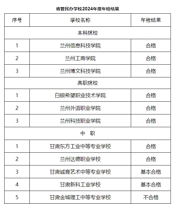 中国甘肃网5月29日讯(西北角·中国甘肃网记者 沈文刚)5月29日,甘肃省教育厅发布了关于省管民办学校2024年度年检结果的通报,其中多所学校年检结果显示不合格。