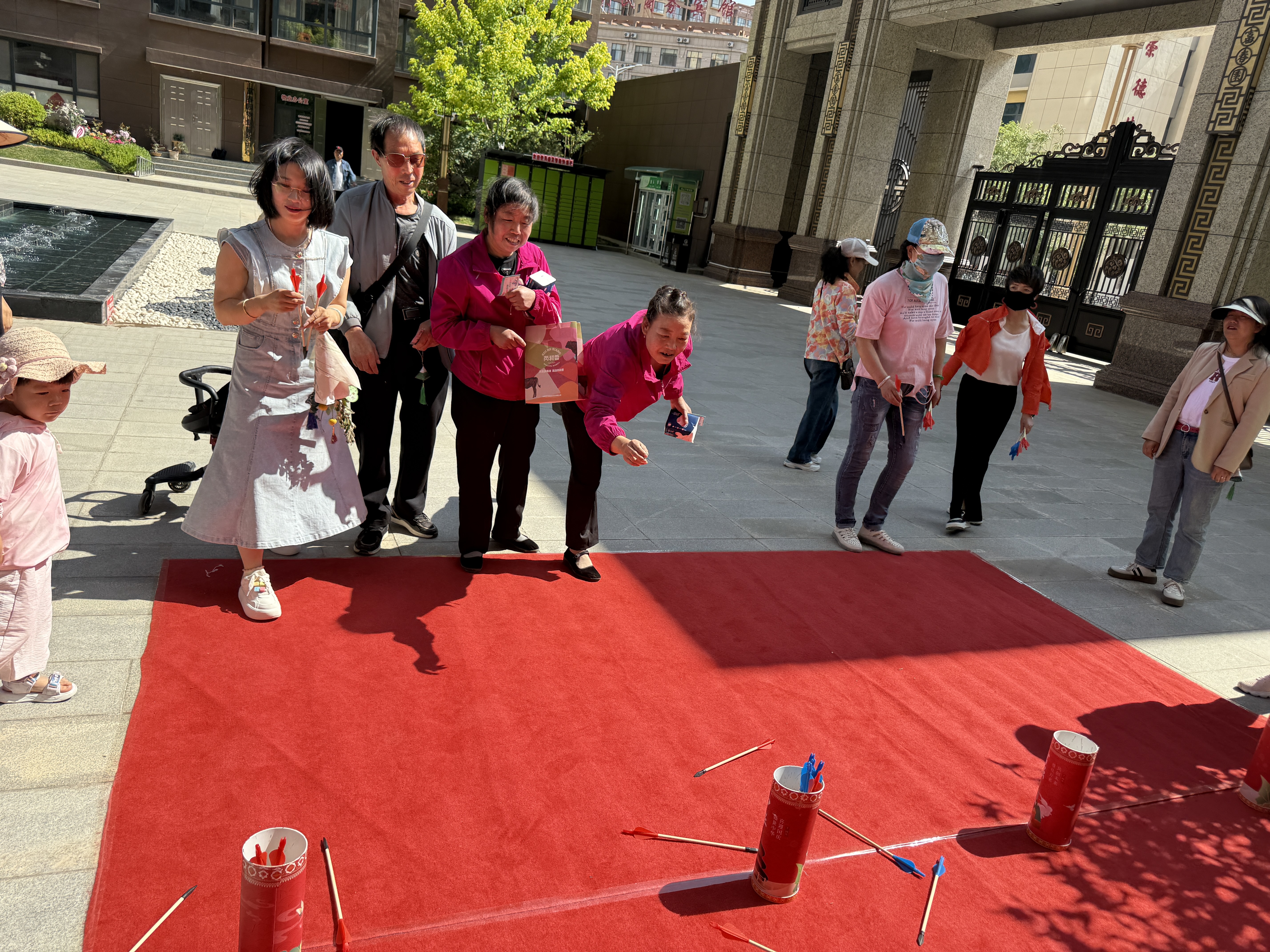 广场一隅,古色古香的投壶区将千年前的文人雅趣“搬运”到现代社区。各色的壶具静静伫立,三支竹箭在阳光下泛着温润光泽,大朋友小朋友纷纷化身“古代士大夫”,屏气凝神、引弓待发,活动还别出心裁地设置了“投壶积分赛”,老老少少排着队轮番上阵,欢笑声、惊叹声此起彼伏,传统游戏在创新玩法中焕发勃勃生机。