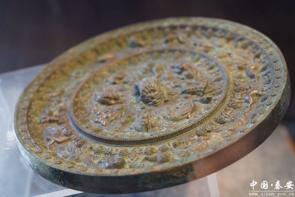 在秦安县博物馆的馆藏精品文物中,唐代海马瑞兽葡萄纹铜镜堪称镇馆之宝。这件铜镜直径达29厘米,厚2厘米,重4500克,以青铜精心铸造而成,是目前甘肃省出土铜镜中体形最大的一面。