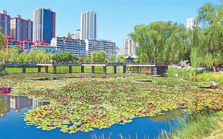 沿着浓荫蔽日的林荫道前行,裹挟着水汽的微风拂过耳畔,吹散了夏日的暑热。抬眼望去,大片水域在草木间隙若隐若现,粼粼波光如同洒落湖面的碎银,折射出夏季独有的璀璨。这片占全园面积32.29%的水域,宛如被巧匠精心雕琢的明镜,大小湖面彼此呼应:开阔处如镜,倒映流云飞鸟;狭窄处蜿蜒,被垂柳枝条裁成细带。荷叶田田铺满浅滩,粉白荷花随风轻摇,惊起几尾红鲤跃出水面,水花融入涟漪,更添灵动之美。极目远眺,黄河北岸山峦化作黛色剪影,与天际线相接;脚下隐约传来黄河奔涌的涛声,为这片柔美湖水注入了西北独有的苍茫。