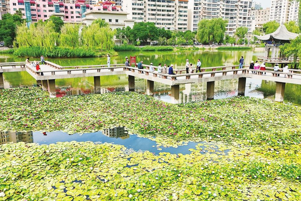 6月5日,游客在兰州小西湖公园游玩。夏日的小西湖公园绿意盎然,莲叶层层叠叠、连绵成片,粉白相间的莲花星星点点绽放,宛如一幅灵动的画卷。新甘肃・甘肃经济日报记者 瞿娟 摄