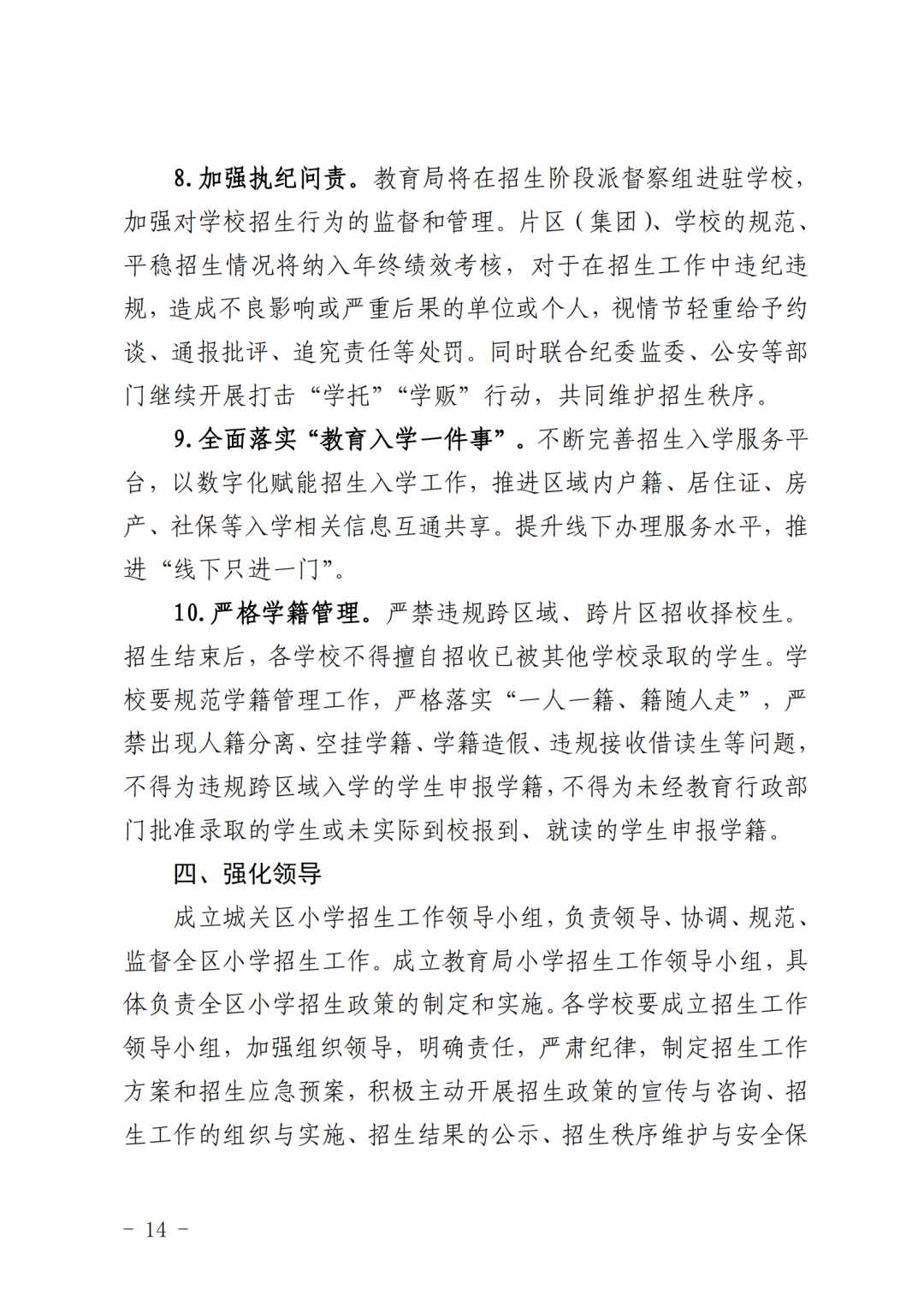 (三)全纳平等原则。残疾儿童接受义务教育的入学年龄根据实际可适当延迟。非本区户籍人员子女入学以居住证为主要依据,保证符合条件的随迁子女应上尽上,依法保障随迁子女、特困家庭子女、留守儿童少年平等接受义务教育。继续执行同一学校片区内一套房产六年内只提供一个学位政策(同一户主符合计划生育政策情况除外)。不得以任何形式的考试、变相考试等方式确定生源,严禁以各类竞赛、考试、证书等作为招生入学依据或参考。