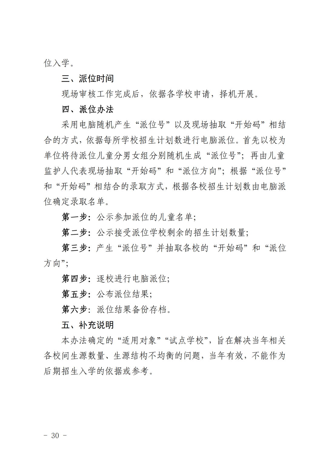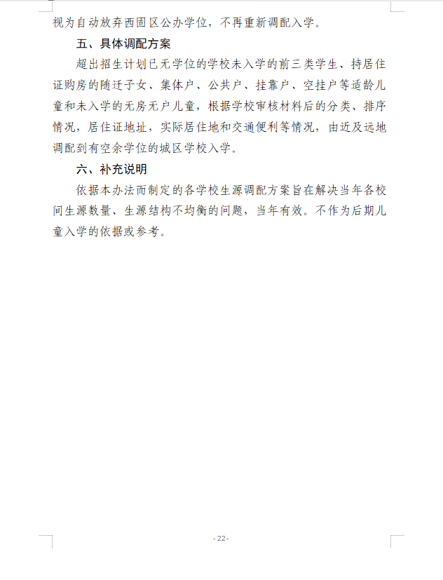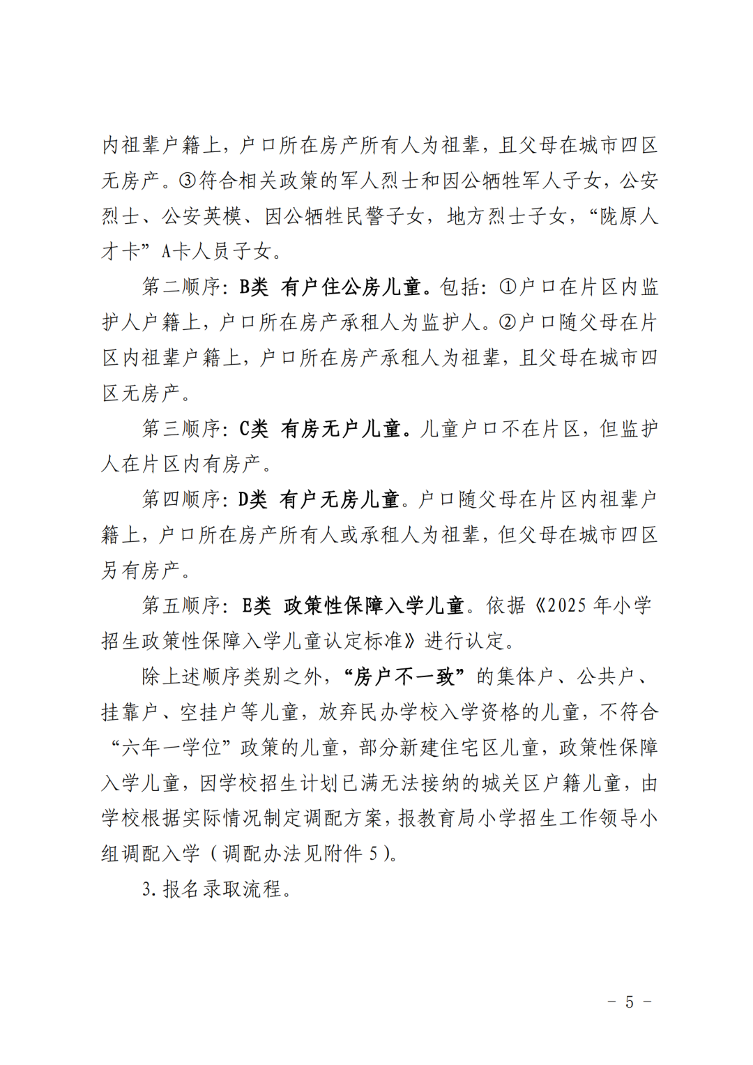 3.招生顺序:各学校根据适龄儿童户籍和监护人房产情况,依据“人房户一致”优先原则,在划定片区内按招生类别顺次录取入学,确保适龄儿童公平公正接受义务教育。学位过于紧张的学校,如果同一类别无法全部容纳,则按适龄儿童成为该类别的时间先后排序入学。因学校招生计划已满无法接纳的学生,由区教育局和学校根据招生类别、排序情况等,调配到其它有学位的学校入学。