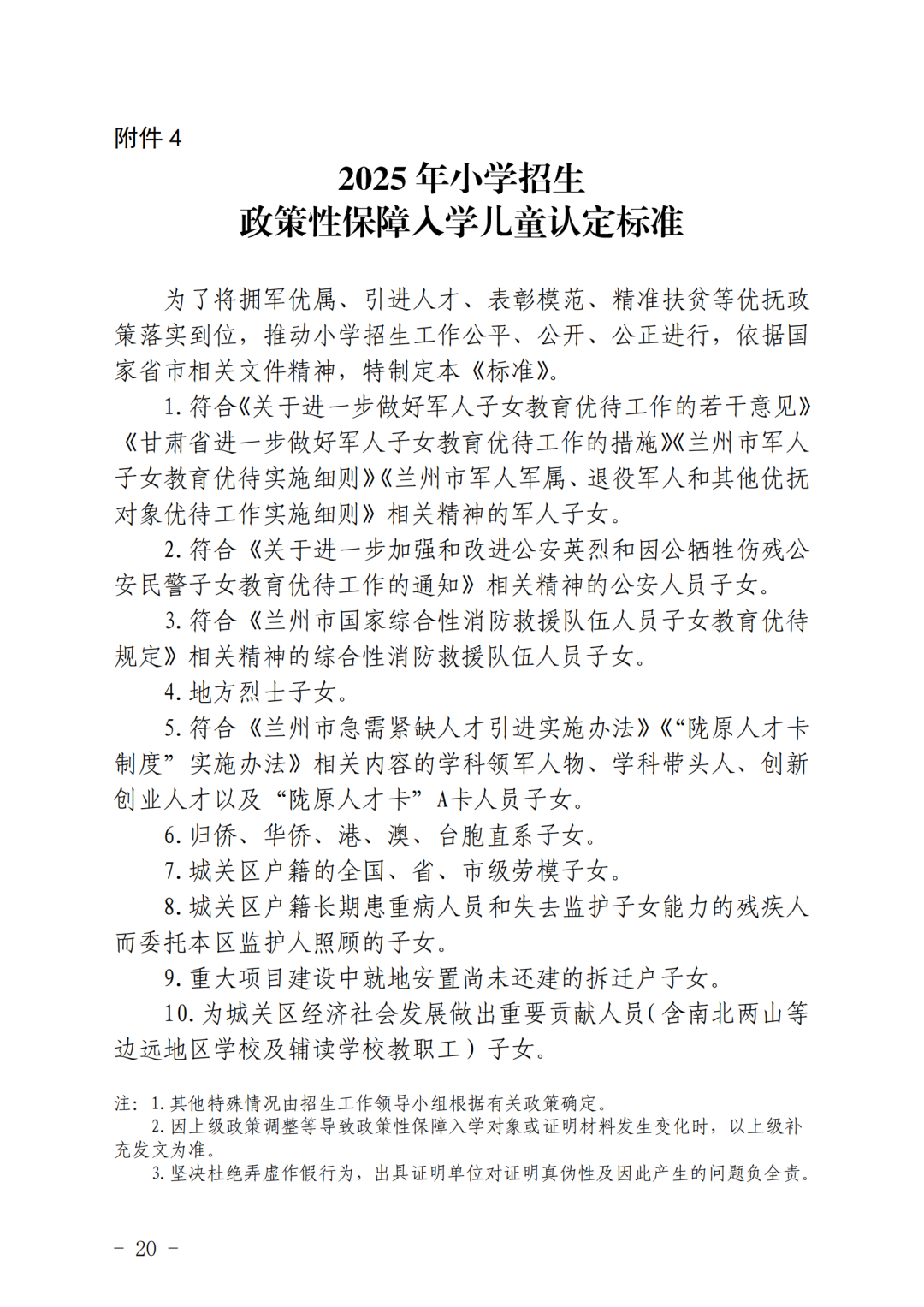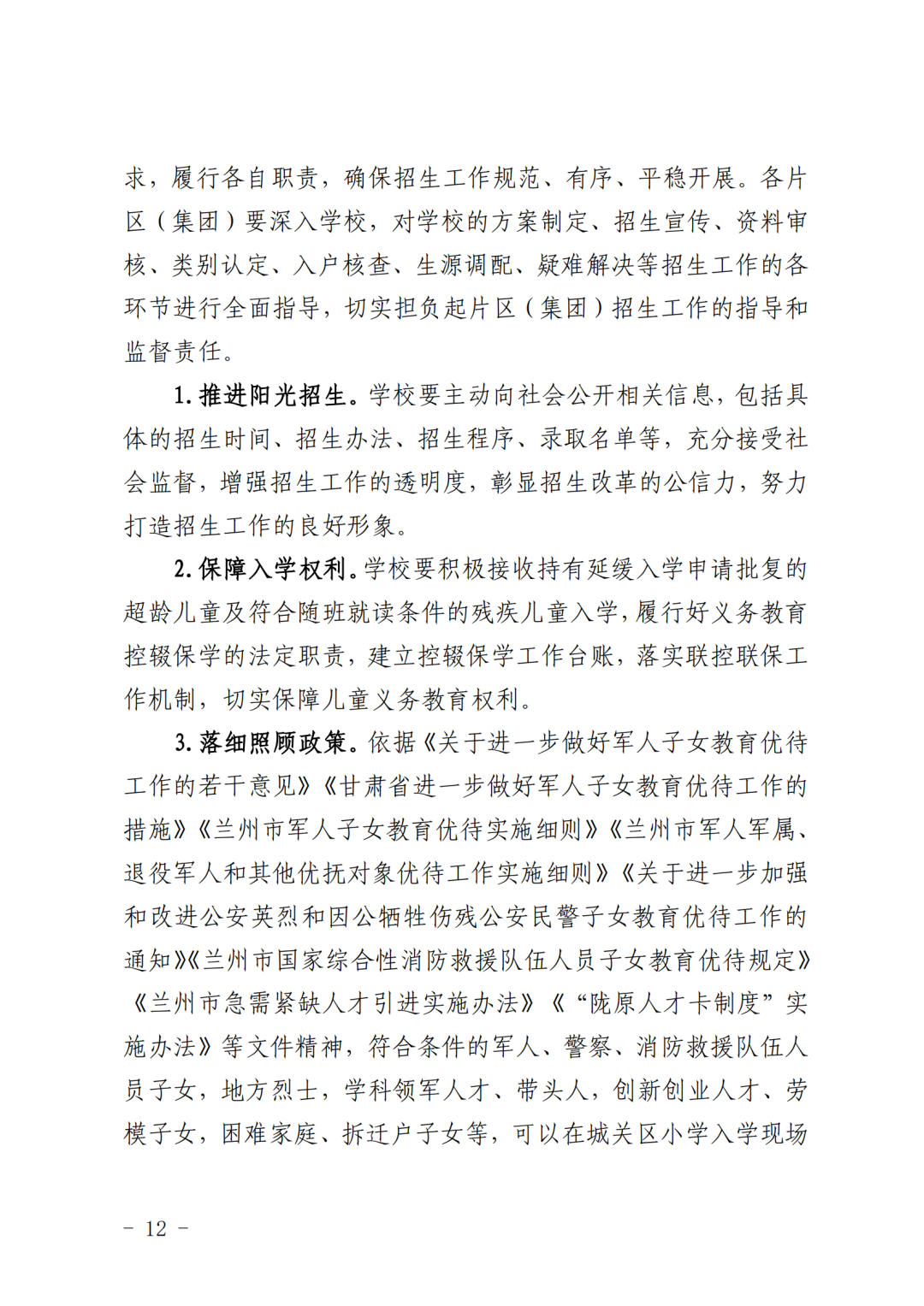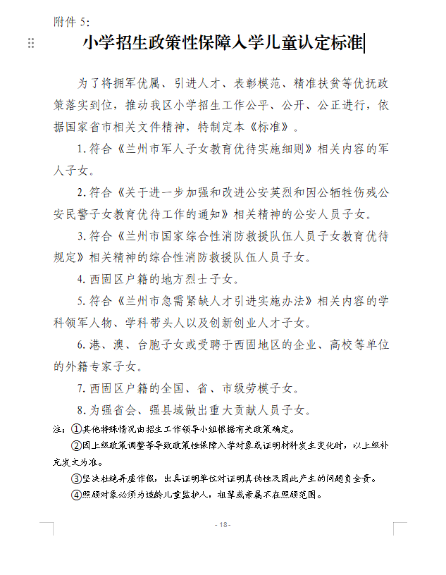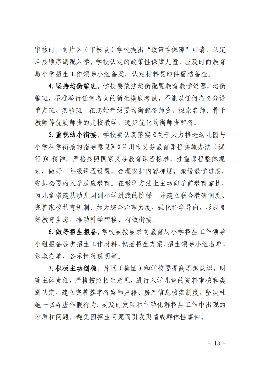 5.招生要求:(1)因疾病或特殊情况需要延缓入学的,由其监护人提出申请,附县级以上医院证明或病历,报教育行政部门核准并备案。延缓期满后,应及时入学。(2)适龄儿童报名上传至招生系统的各项材料应真实有效。今年甘肃省政务服务网入学一件事系统与省公安厅和自然资源局已对接,可核查入学儿童和户主户籍信息,以及监护人房产信息。一经查实有弄虚作假的行为,一律视为非片区招生对象,取消本片区入学资格,由区教育局直接调配到其它有学位的学校入学。对持有伪造或虚假入学资料仍滋事的家长,以系统中上传的虚假信息照片为线索,依据《户口登记条例》第二十条和《治安管理处罚法》第五十二条移交公安部门依法给予治安管理处罚或者追究相关责任。(3)各校通过政策性保障招收的入学学生,要将享受政策的依据、相关证明材料等报区教育局小学招生工作领导小组审核、备案。(4)要求辖区所有学校(含市属小学和农村小学)都必须通过招生系统进行招生。对个别无法进行网上报名的家长,学校可视具体情况代报,但鼓励家长自己操作。