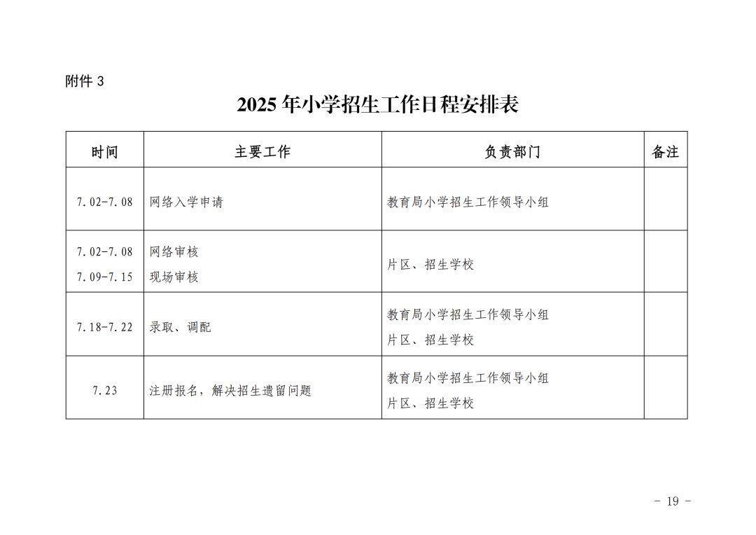 3.招生时间。辖区省、市、区属及民办小学网络登记统一申请时间为6月19日8:00—6月25日20:00;电脑派位学校现场资料审核时间为6月27日至29日,超计划电脑派位时间为7月3日。省属事业高校附属小学及区属小学现场资料审核时间为7月5日—7月6日;录取调配时间为7月7日—11日;辖区所有小学录取结果公布时间为7月12日11:00,注册报名时间为7月12日13:00—17:00。所有入学儿童必须按时参加网络入学申请、现场审核、注册报名等入学流程,否则仅能待秋季开学前一周,由区教育局根据实际学位情况实施统筹调配入学。