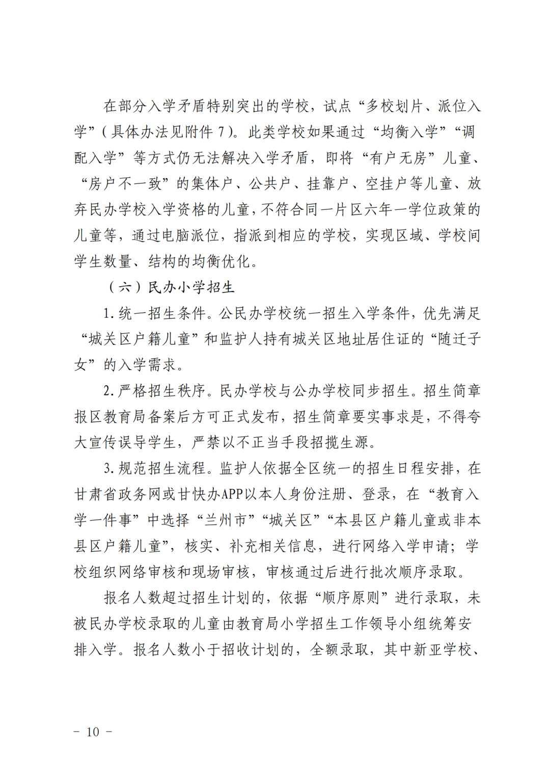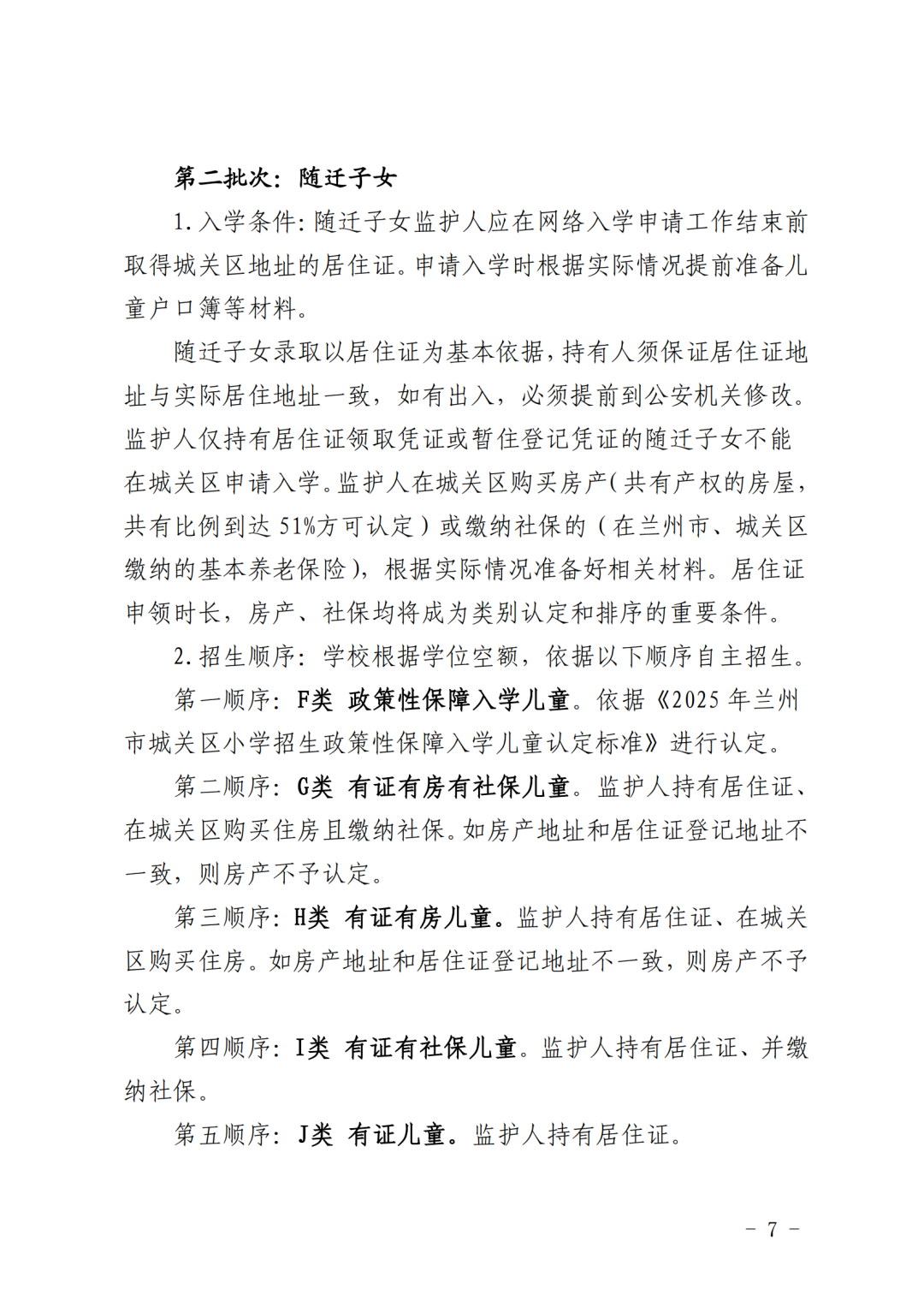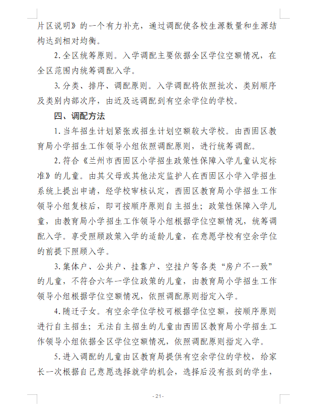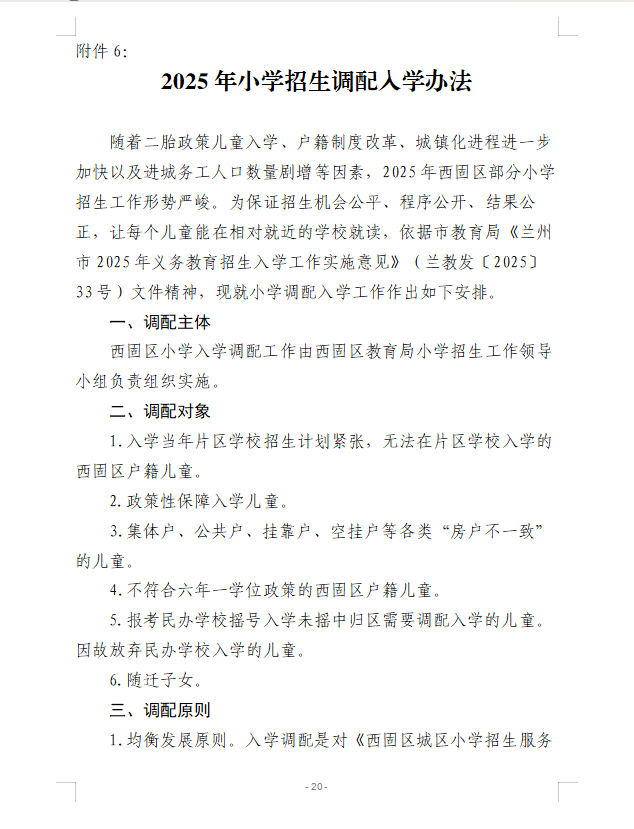 6.相关说明:(1)各学校招生按招生顺序依次招生(A,B,C,D,E,F,G,H),按顺序招满后,未招收的学生由学校和区教育局按相关政策统筹安排,不服从调配的随迁子女视作自动放弃在西固区公办学校入学机会,回户籍地就读。(2)所有入学儿童必须在规定时间完成网上报名,7月5日后不再接受网上报名,未参加网上报名的学生登记后在8月底开学前调配入学。(3)农村各校仍按原片区招生。(4)落实同一学校片区内一套房产六年内只提供一个学位(同一户主符合计划生育政策情况除外)的政策。后台审核系统可自动比对,核查学位是否占用。(5)监护人无房产证仅持购房合同的,须同时出具购房机打发票原件和兰州市不动产登记信息查询证明,发票购房人名称与购房合同房产所有人必须一致。私下交易的购房合同,不予认可。(6)正在建设中的小区,已入住的(指已办理入住手续的),片区内学校可根据学位情况排序解决入学。未入住的,在实际居住地片区报名入学。正在建设中的小区,不列入划片招生范围,待建成后统筹划片。