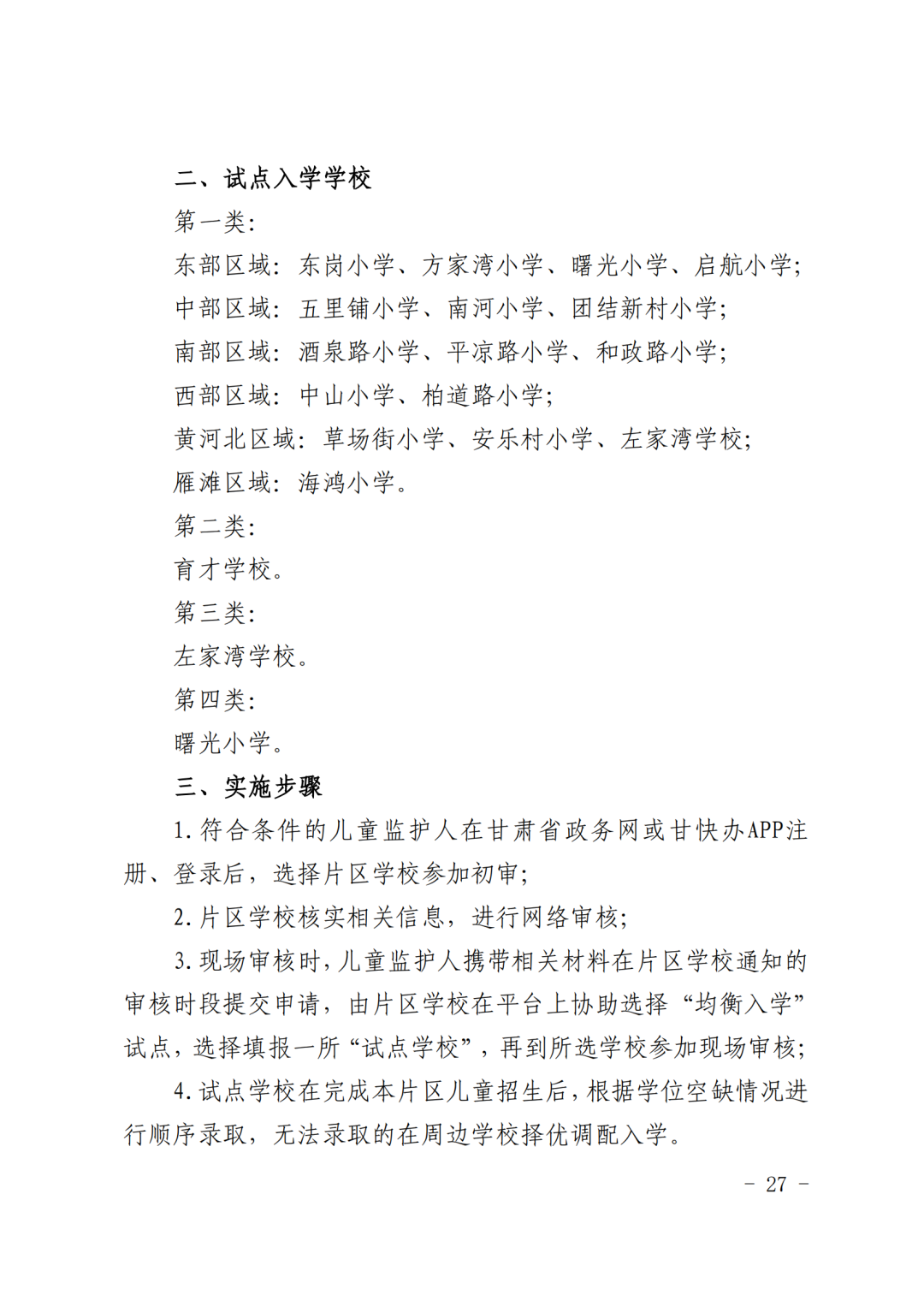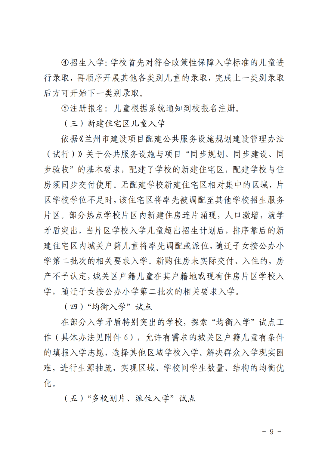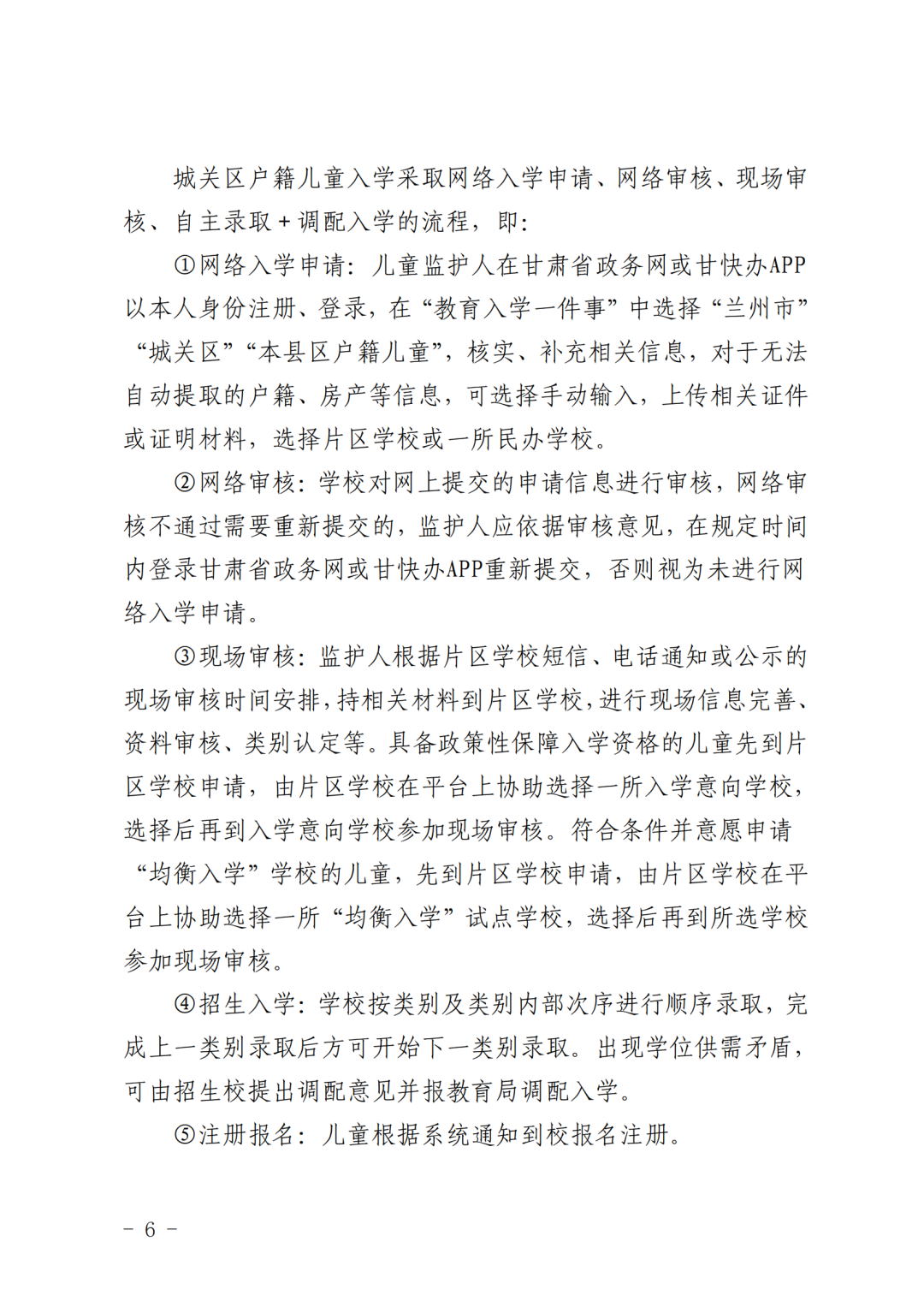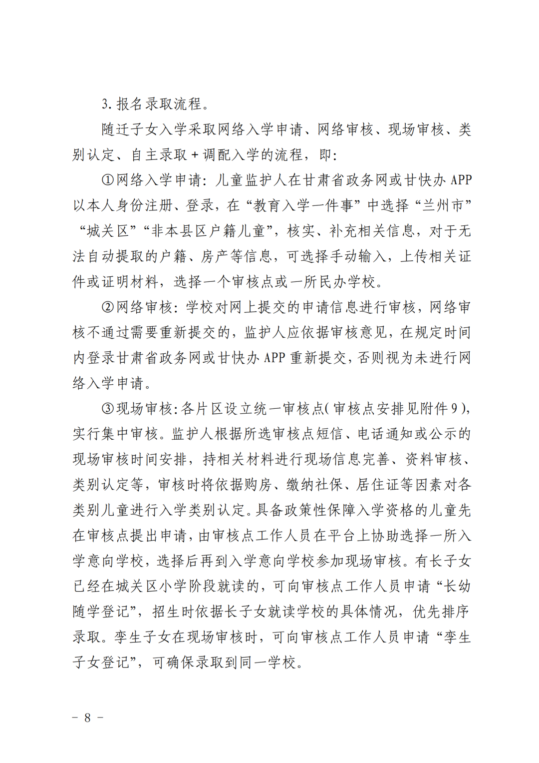 7.落实“教育入学一件事”。今年兰州市各县区小学招生入学工作全部纳入“甘肃智慧教育平台中小学入学招生系统”进行,推进公安、住建、教育等部门联动的网络报名审核机制,优化入学流程、精简证明材料,实现报名、材料审核录取“线上一网通办”。根据需要在学校设置线下办理站点,进行现场政策解答、材料审核、填报指导等工作,明确入学需要提交的材料内容和具体要求。适龄儿童监护人可使用自己的身份证信息注册登录甘肃省政务服务网或甘快办APP,根据系统提示提交相关信息,完成报名。在规定的时间内学校审核、录取后反馈结果。