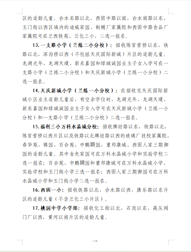 4.兰炼一中附属实验学校一年级招生:4个班招生计划用于统筹解决兰炼一小(福利二小)、兰炼二小和福利三小未被录取的学生,剩余计划面向区内其他学生招生。具有西固区户籍的适龄儿童可在6月24日至26日申请网上报名。当报名人数未超过学校招生计划时,则全额录取;报名人数超过学校招生计划时,采取100%招生计划电脑随机派位录取。未被录取的学生可继续填报片区内学校。