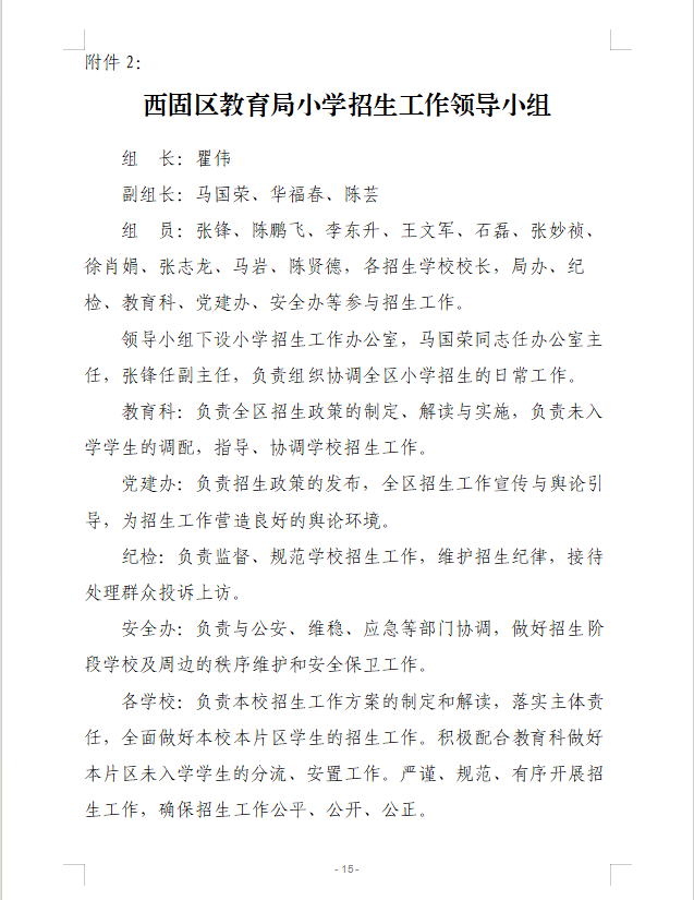 辖区各招生学校(含市属各小学)要按要求向西固区教育局小学招生工作领导小组报备各类招生工作材料,包括招生方案、招生领导小组名单、录取名单、公示情况说明等。