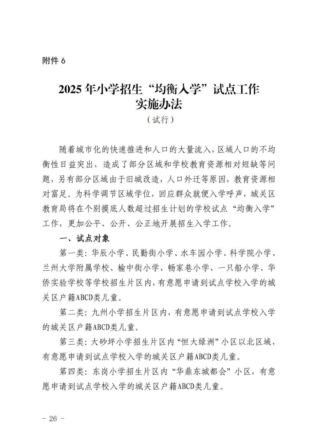 根据《甘肃省义务教育阳光招生专项行动(2025)实施方案》、《兰州市2025年义务教育招生入学工作实施意见》(兰教发〔2025〕33号)等相关文件精神。为促进义务教育优质均衡发展,推进阳光招生,健全公平入学长效机制,加快推进“教育入学一件事”落地见效。结合全区实际,现就做好我区2025年义务教育阶段招生入学工作,特制定本方案。