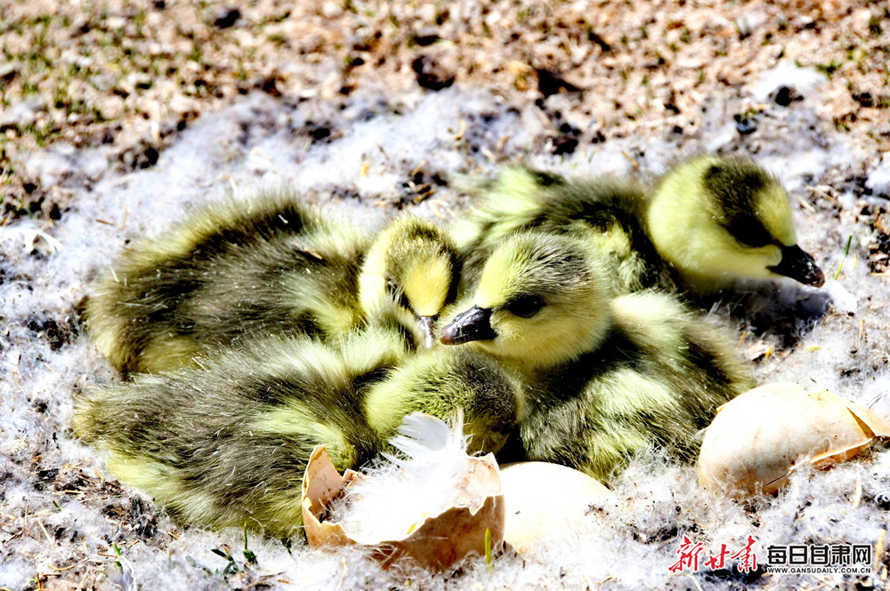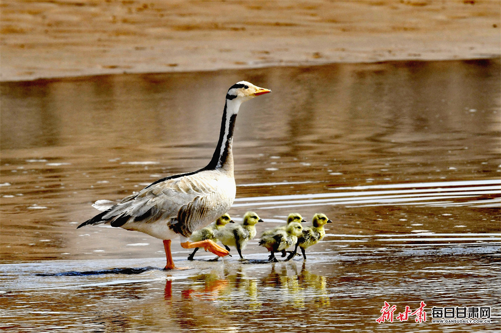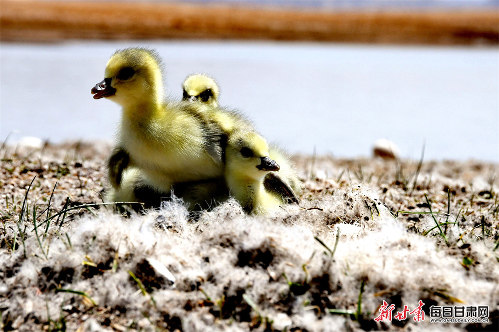 近日,在位于肃北县境内的甘肃盐池湾国际重要湿地的碧波之上,一群毛茸茸的斑头雁幼鸟紧紧跟随着亲鸟,在浅滩间悠闲觅食。嫩黄色的绒毛在阳光下闪烁,小家伙们或笨拙地低头啄食水草,或歪着脑袋打量周围的世界,憨态可掬的模样为湿地增添了勃勃生机。
