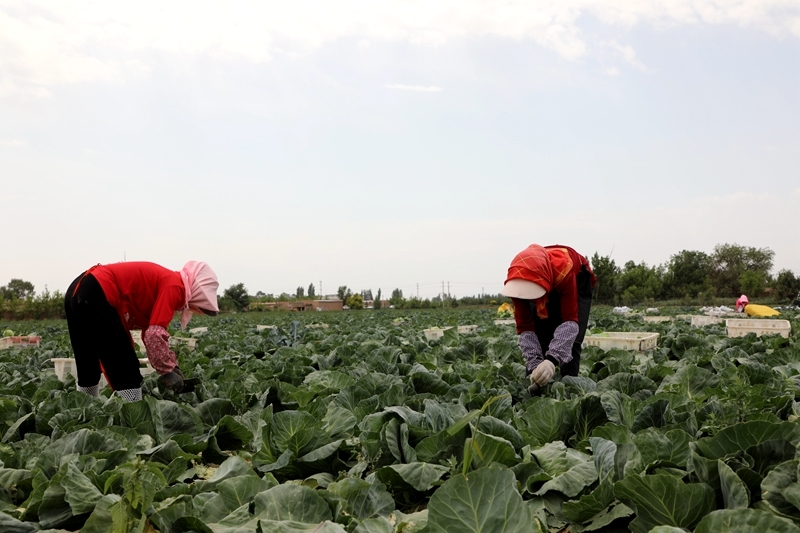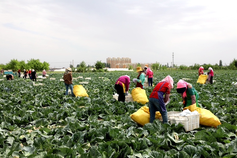 仲夏,临泽县头茬高原夏菜迎来丰收。在沙河镇高原夏菜种植基地,一垄垄甘蓝掩映在片片绿叶下,村民们穿行在菜地里娴熟地收割、装筐、搬运、分拣、装车,一派繁忙的丰收景象。