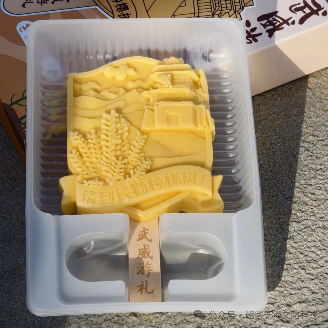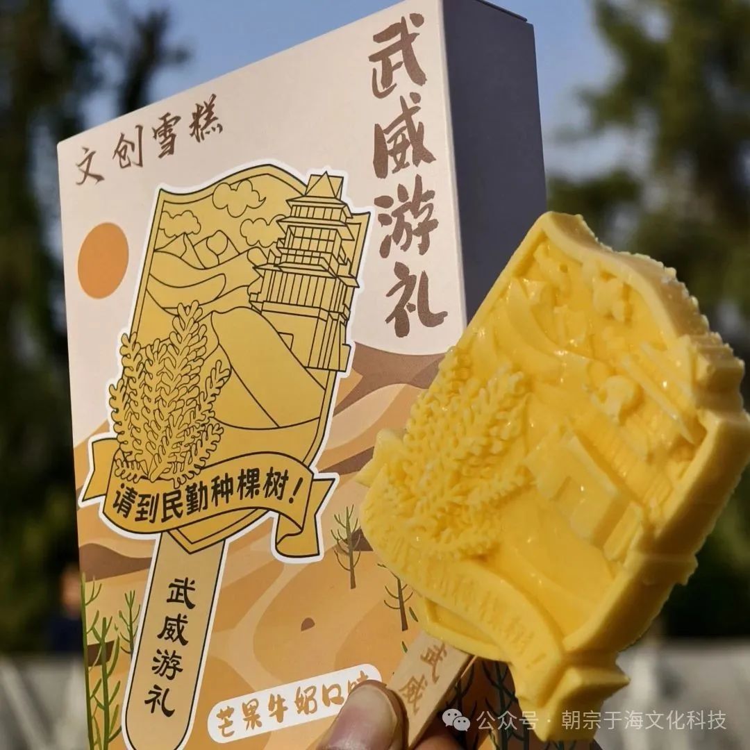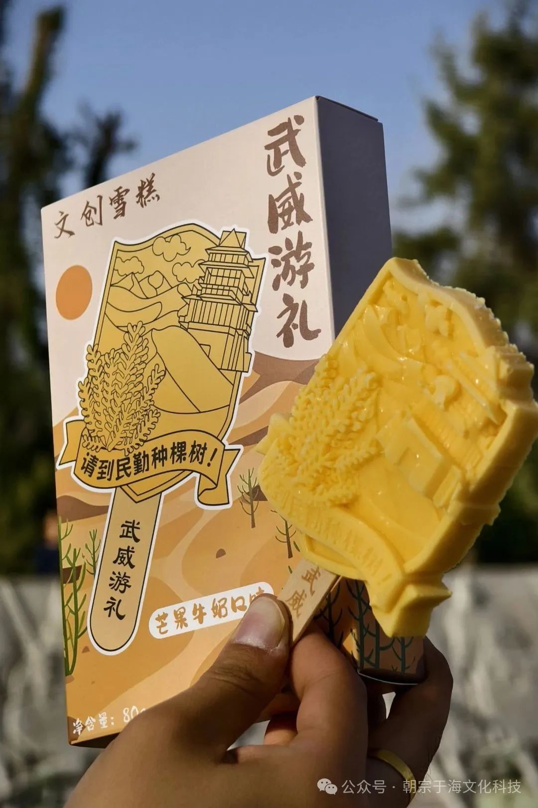 芒果味雪糕同样惊喜满满,它以民勤治沙为设计元素,雪糕上雕刻着民勤治沙的树木和建筑的图案,象征着丰收与繁荣,“请到民勤种棵树”的标语,传递着这座城市对生态的呼唤。拿着它,仿佛握住了武威的生态故事与人文温度,吃之前别忘了和它来一组创意合拍,让雪糕与武威的风景同框,定格专属旅行记忆。