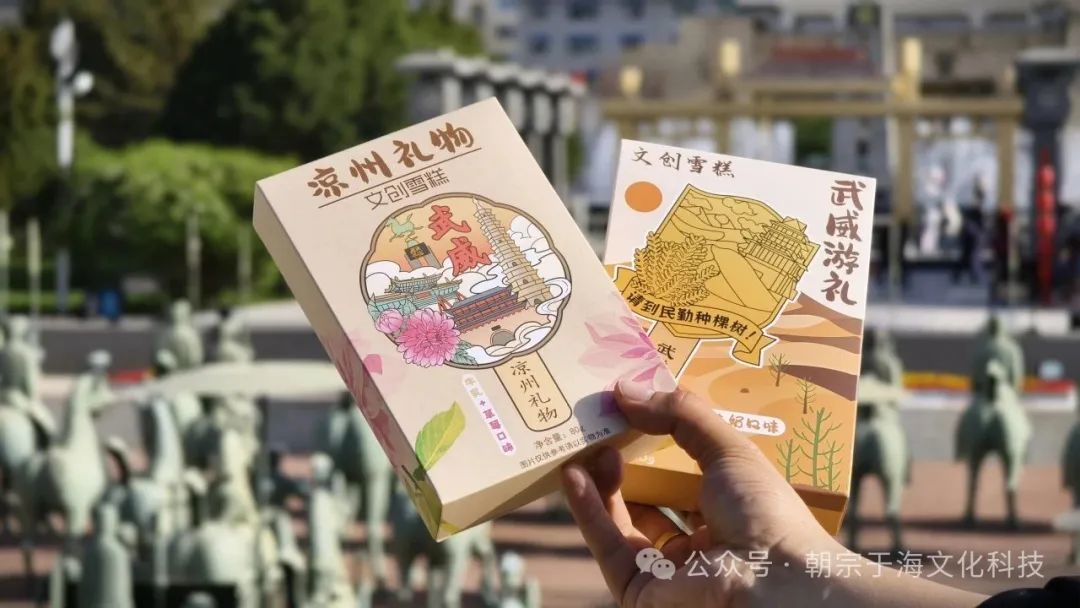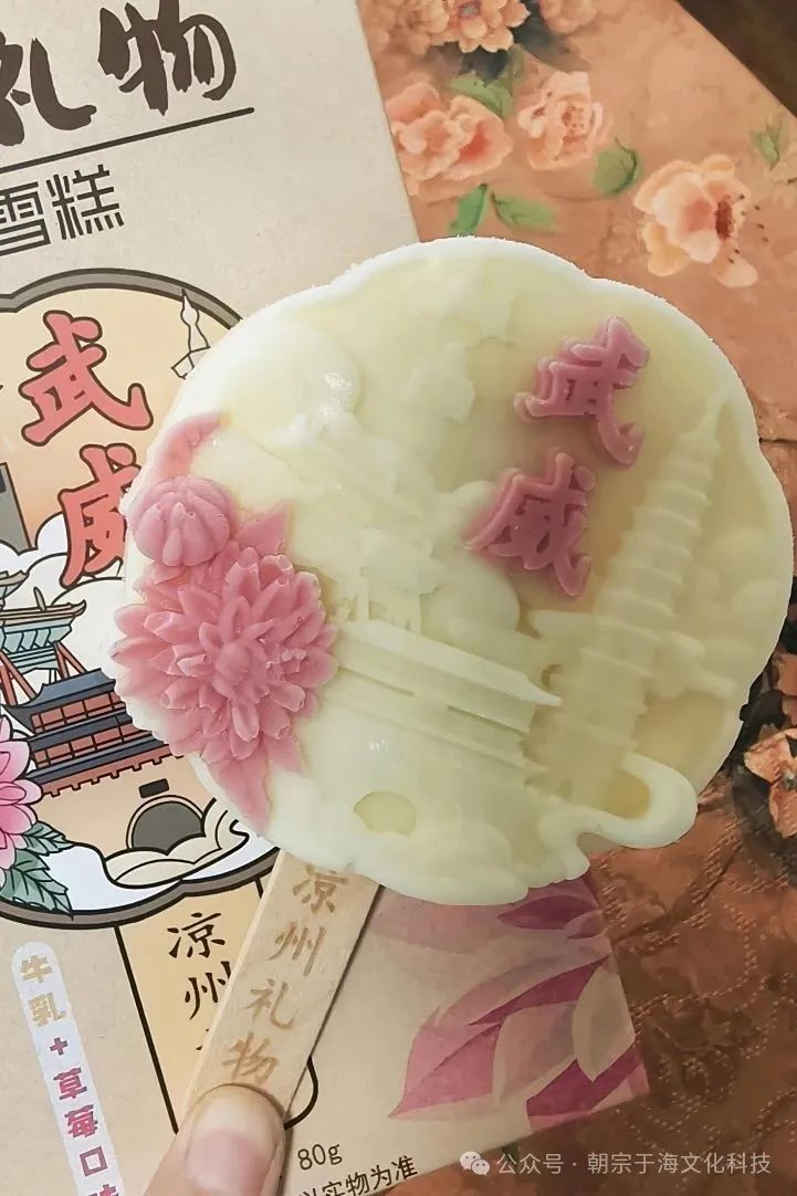 草莓牛乳味雪糕,圆形的冰品上,“武威”二字苍劲有力,一旁的建筑与宝塔,复刻出武威标志性景观,搭配娇艳的花朵,就像把武威的蓝天白云、历史建筑都凝在这一方雪糕里。拿在手中,走在武威的街头巷尾,随手一拍,都是朋友圈最吸睛的“打卡照”,妥妥成为旅行路上的时尚单品。