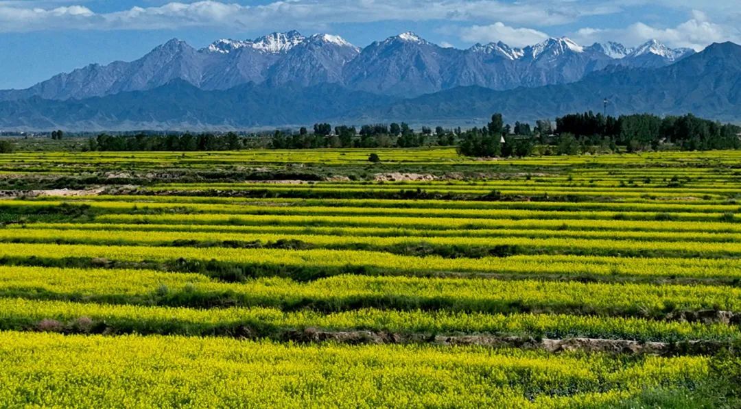 6月19日,雨后初晴,祁连山国家公园甘肃省张掖市民乐县丰乐镇段的祁连山上苍松翠柏傲然挺立,山下的民乐县丰乐镇易家湾村,绿油油的庄稼生长旺盛,林木蓊郁层林尽翠,犹如“巨幅绿毯”,盛开的油菜花宛如一片金色的海洋,当微风吹过时,油菜花海便掀起了层层的波浪,仿佛在演奏一曲曲乐章。广袤的田野上呈现出一幅生机勃勃的美丽画卷。(张掖市融媒体中心记者 王将)