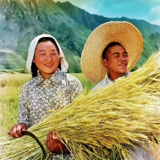 1959年,文县城关公社贾昌生产队青年突击队突击手孙桃翠(左)和生产能手宋世杰丰收时的喜悦。甘肃日报记者 生源