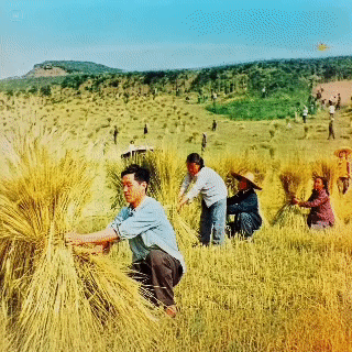 1960年,徽成县成川人民公社开始收割小麦,全社5.5万亩小麦获得空前大丰收。甘肃日报记者 黄对岱