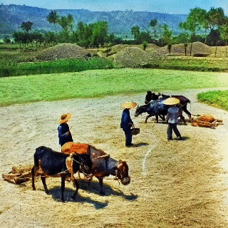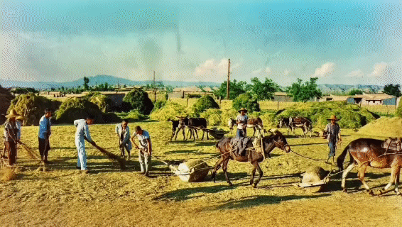 1959年,靖远县水川沿河地区的各人民公社夏收已胜利结束,社员正抓紧时间进行打碾入仓。甘肃日报记者 张志升