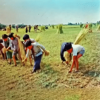 1960年,成川镇北关小学的学生们在拾麦穗。甘肃日报记者 黄对岱