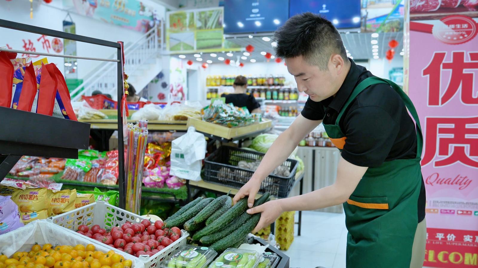 田红玉熟练地整理着货架:“瞧这黄瓜,顶花带刺儿,大清早从种植基地摘的,跟刚下秧一样脆生。我们一天送两趟货,保证大家买到的都是最新鲜的。”旁边一位大妈拿起一根黄瓜闻了闻:“嗯,是那个清香味儿。在家门口就能吃上现摘的菜,真方便!”