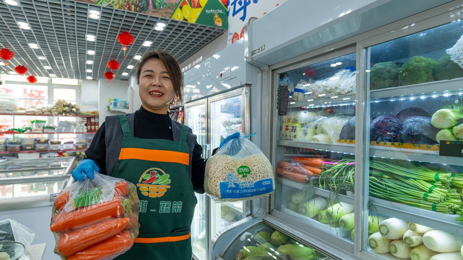 在“甜甜蔬菜”店,冷柜里码着的菜,总是水灵灵的。这份新鲜,即源自新区种植基地。