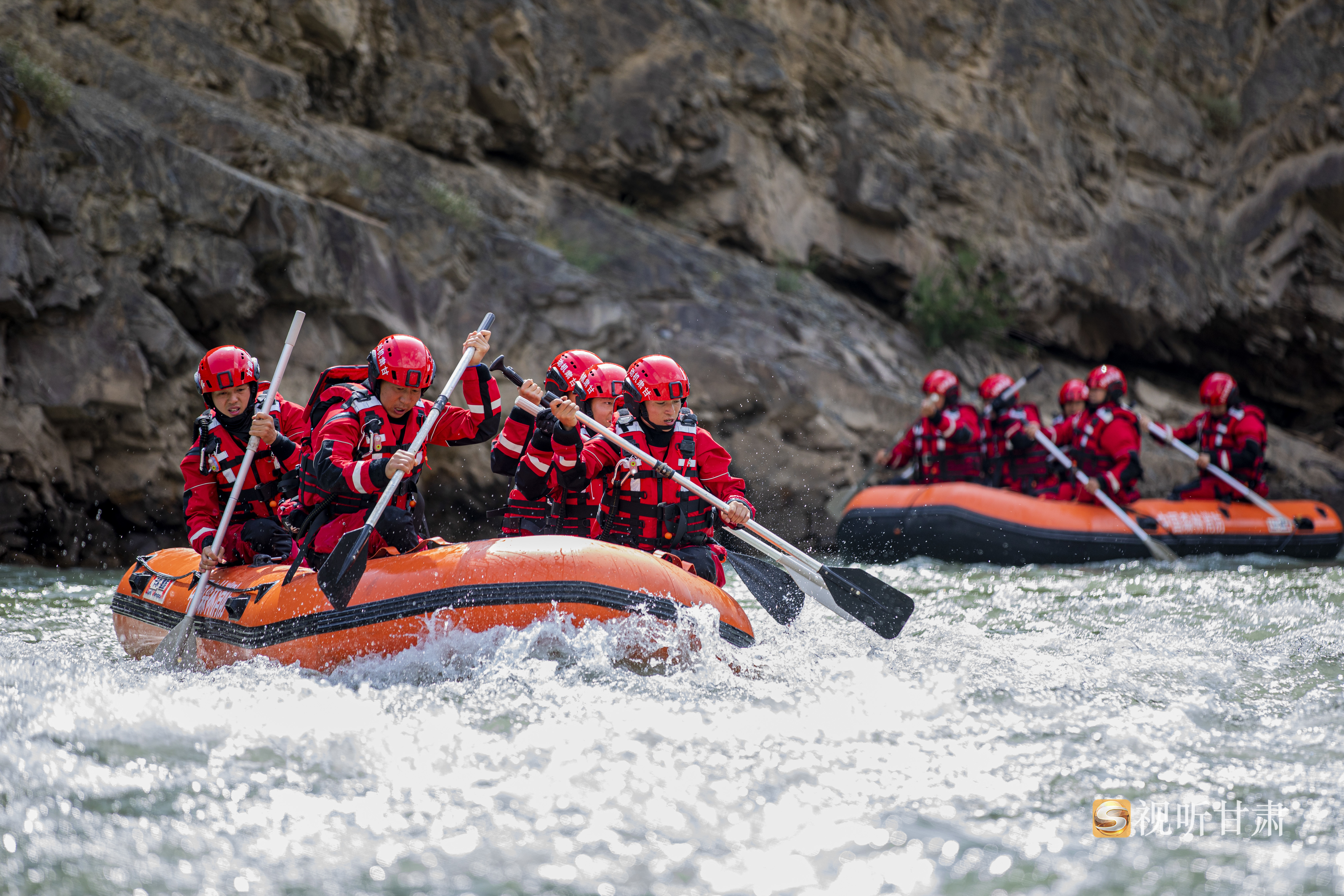 消防救援人员利用船桨开展无动力划艇自救
