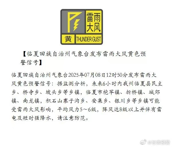 临夏回族自治州气象台发布雷雨大风黄色预警信号