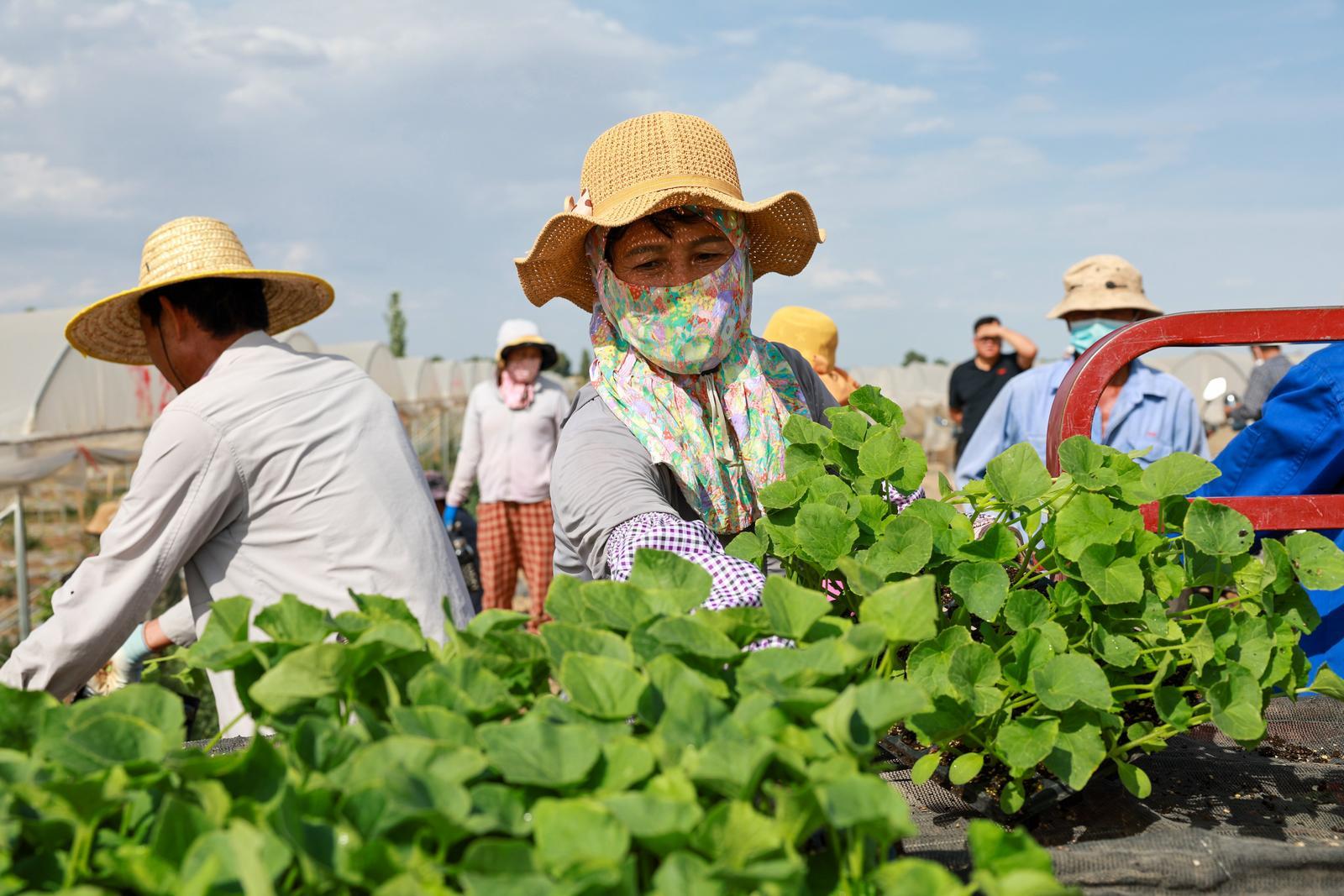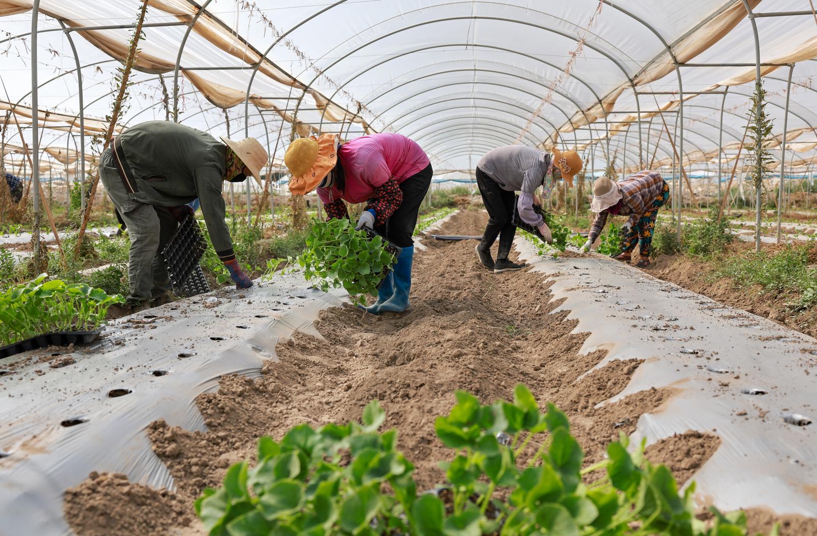 在不远处的拱棚种植区,工人们正在紧锣密鼓地为瓜苗“落户”。几个月后,这些承载着希望的幼苗,将结出香甜可口的金塔蜜瓜,走向市场。