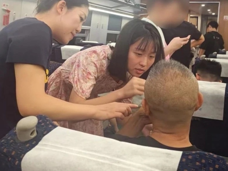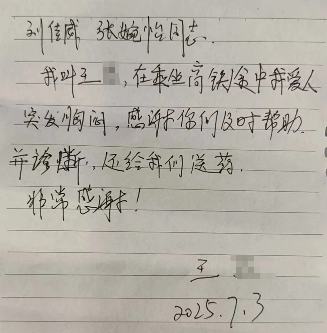 张婉怡赶来评估后初步判断为心脏不适,果断取出随身携带的速效救心丸,指导张先生舌下含服,并叮嘱其保持坐姿。不久,张先生胸闷症状明显缓解。二人观察到车厢环境对呼吸不利,主动将通风口的座位让予张先生夫妇。