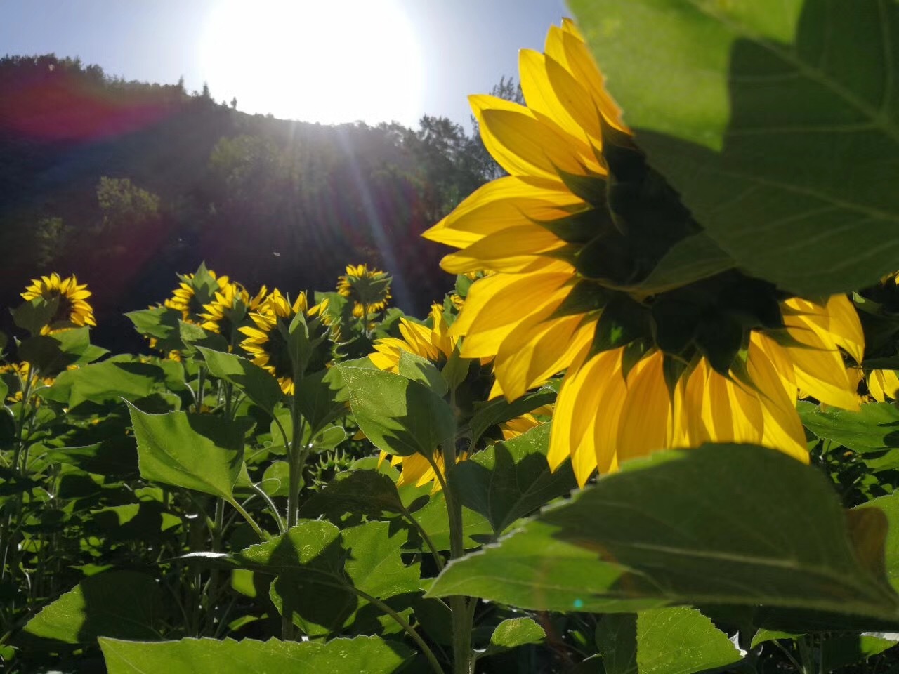 株株向日葵昂首挺胸、向阳而立,硕大的花盘如金色罗盘般缀满山野,翠绿枝叶与明黄花瓣相映成趣,微风拂过,花海起伏间送来阵阵清香,沁人心脾。