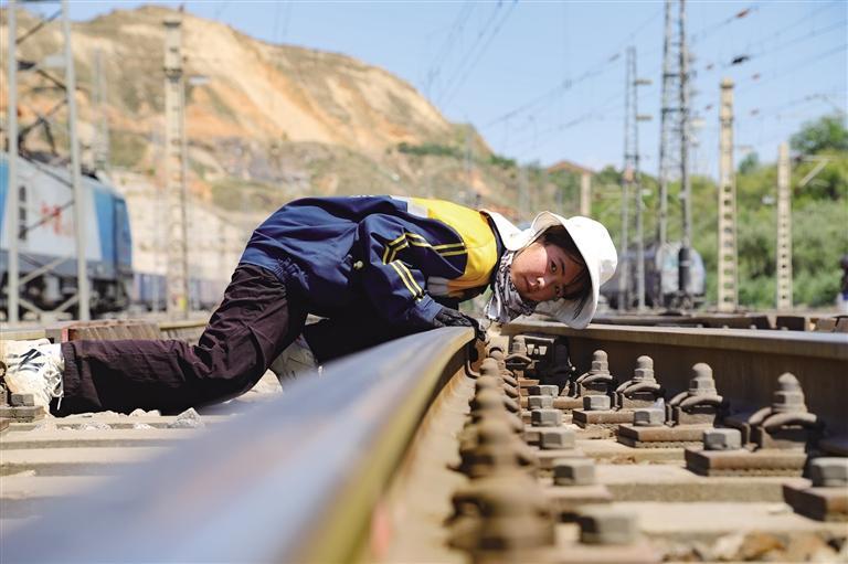 这群人中,23岁的王诗睿和另外一名姑娘郭招娣格外显眼——这位“00后”小姑娘蹲在道岔前,额前的碎发已被汗水浸透,却丝毫没分心:看方向、测高低、量轨距,十几个动作干练利落,一气呵成。