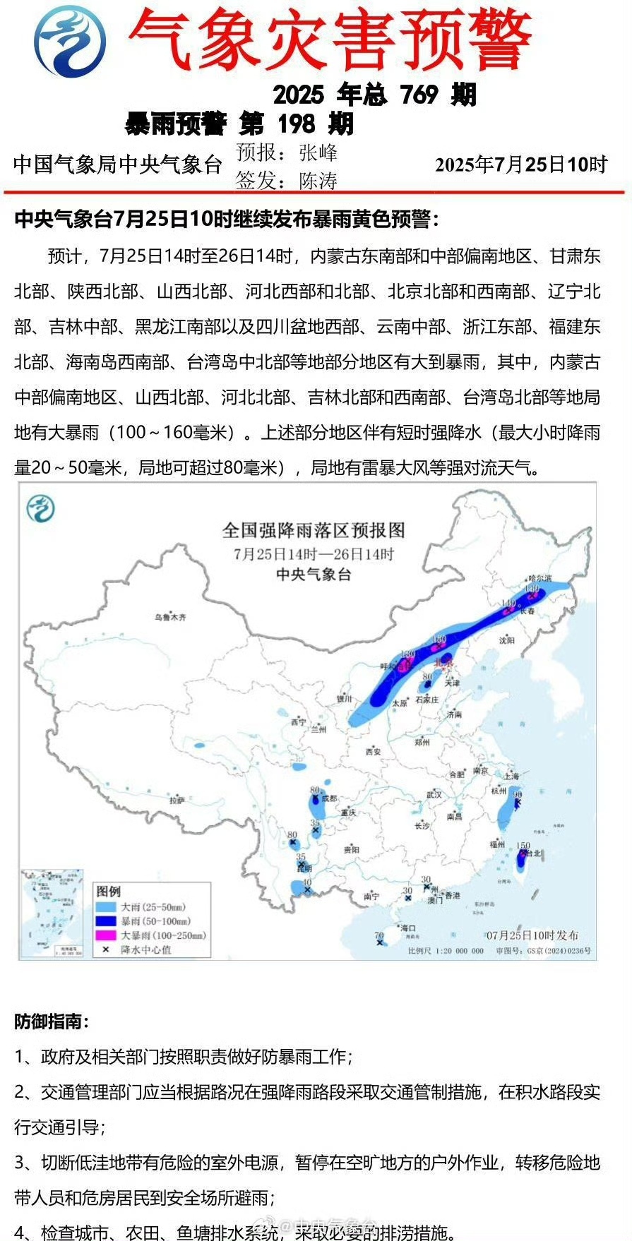 中央气象台官方微博:中央气象台7月25日10时继续发布暴雨黄色预警