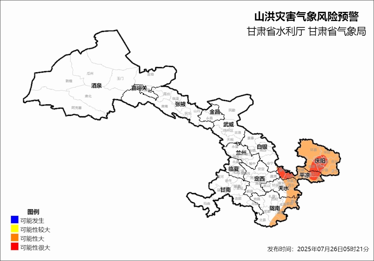 预计,7月26日6时至7月26日17时,平凉市(庄浪县、静宁县、崆峒区、泾川县、灵台县、崇信县),庆阳市(西峰区、庆城县、环县、华池县、合水县、宁县、镇原县)以上地区可能发生山洪灾害可能性很大(红色预警);平凉市(华亭市),庆阳市(正宁县)、天水市(秦州区、麦积区、清水县、秦安县),陇南市(武都区、成县、文县、康县、徽县、两当县)以上地区发生山洪灾害可能性大(橙色预警);其他地区也可能因局地短历时强降水引发山洪灾害,请相关部门注意做好实时监测、防汛预警和提请危险区人员转移避险等防范工作,社会公众注意防灾避险。