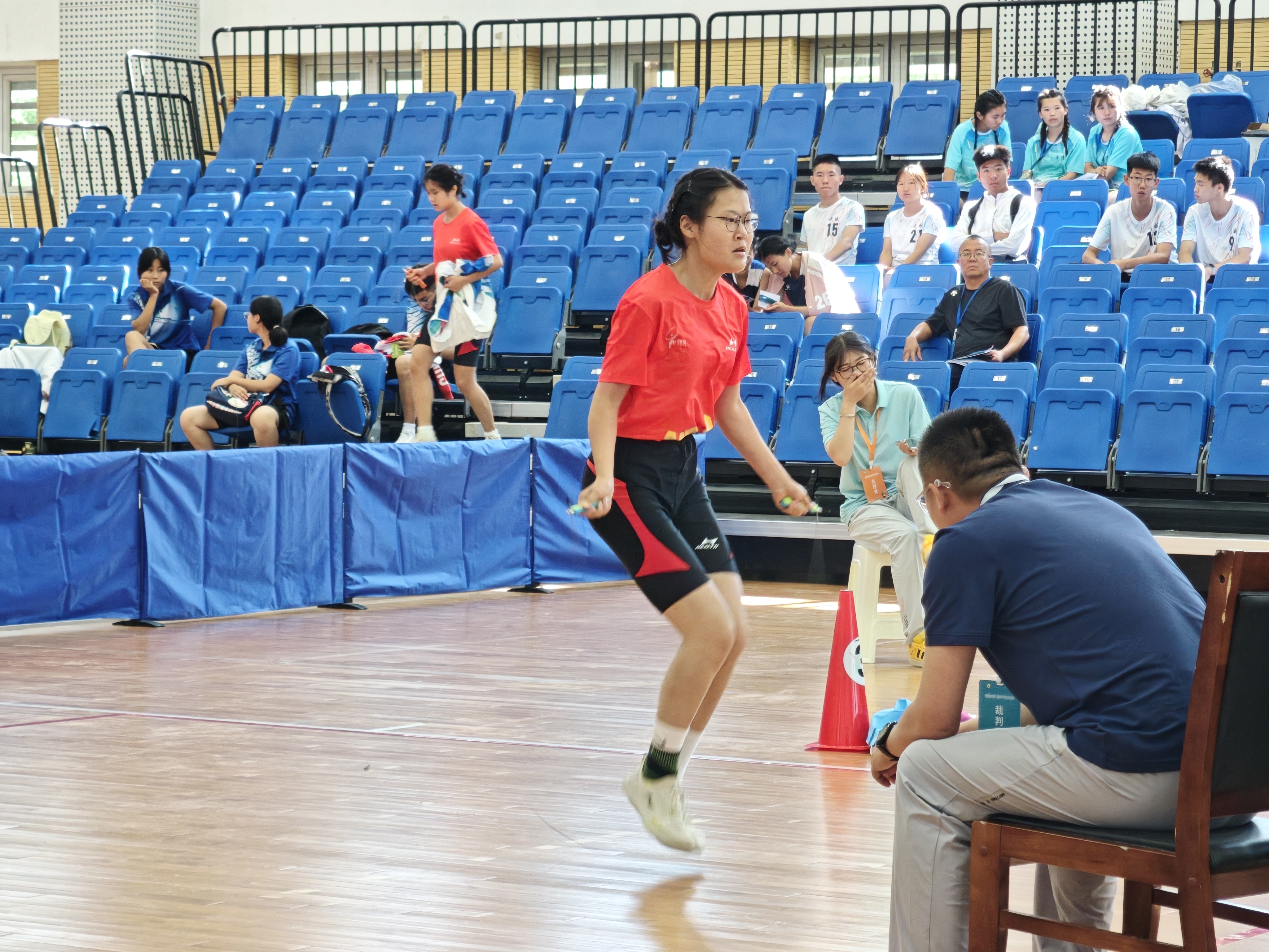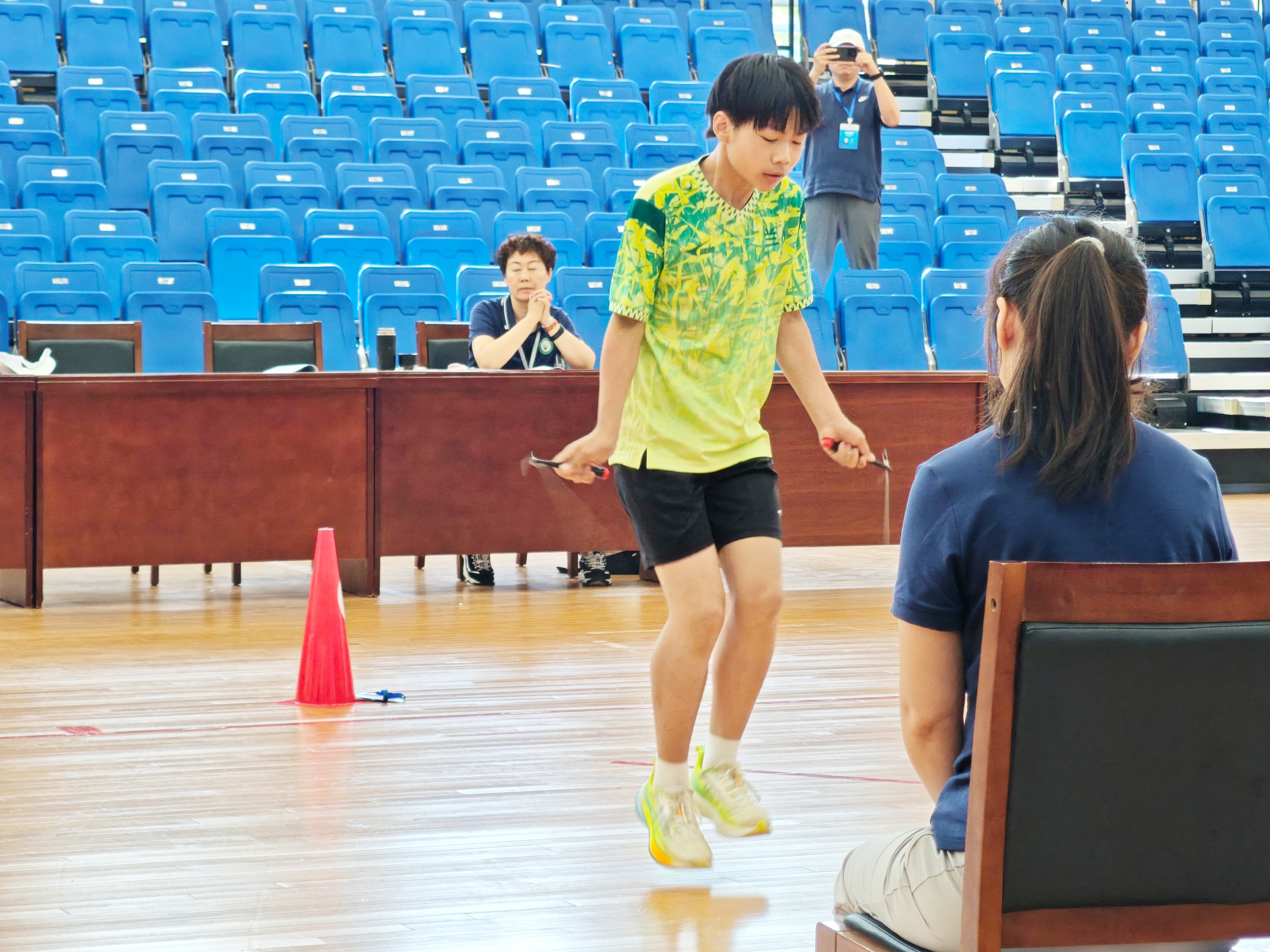 开赛首日上午,赛事节奏紧凑,高潮迭起。随着哨声响起,30秒单摇双脚轮换跳项目率先点燃战火。小选手们全神贯注,手腕翻飞间跳绳如疾风般掠过地面,清脆的“哒哒”声与观众的加油呐喊交织成一片。紧随其后的1分钟单摇双脚轮换跳项目分男子、女子组展开鏖战,运动员在持久战中展现惊人耐力和爆发力,每一次跳跃都是意志与体能的双重考验。赛场气氛紧张激烈,小将们专注的神情、流畅的动作,将力与美凝聚在方寸之间。