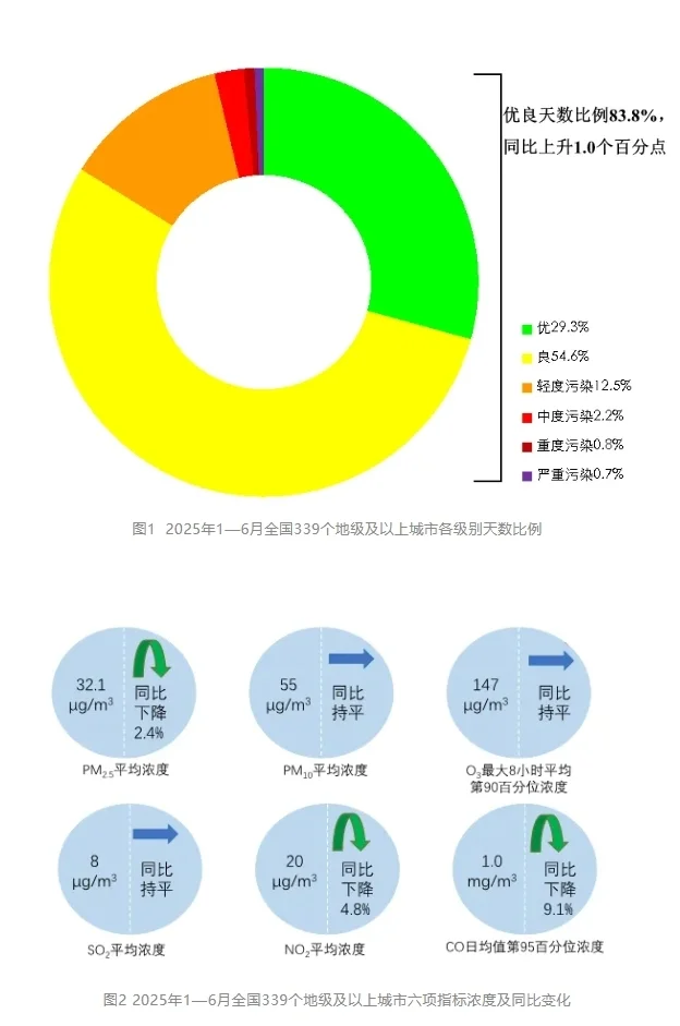 1—6月,全国339个地级及以上城市平均空气质量优良天数比例为83.8%,同比上升1.0个百分点;平均重度及以上污染天数比例为1.5%,同比持平。由沙尘天气导致的平均超标天数比例为4.2%,其中重度及以上污染天数比例为1.0%。