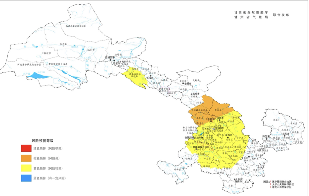 预计8月2日16时至8月3日16时,甘肃省兰州市(红古区、永登县、皋兰县),白银市(白银区、平川区、靖远县、景泰县),兰州新区,武威市(古浪县、天祝县)发生崩塌、滑坡、泥石流等地质灾害的风险高(橙色预警);甘南州(合作市、临潭县、卓尼县、舟曲县、迭部县、夏河县),兰州市(城关区、七里河区、西固区、安宁区、榆中县),陇南市(宕昌县、礼县),定西市(安定区、通渭县、陇西县、渭源县、临洮县、漳县、岷县),天水市(秦州区、秦安县、甘谷县、武山县),白银市(会宁县),张掖市(甘州区、肃南县、临泽县、高台县),临夏州(临夏市、临夏县、康乐县、永靖县、广河县、和政县、东乡县、积石山县),平凉市(静宁县)发生崩塌、滑坡、泥石流等地质灾害的风险较高(黄色预警),请注意防范。