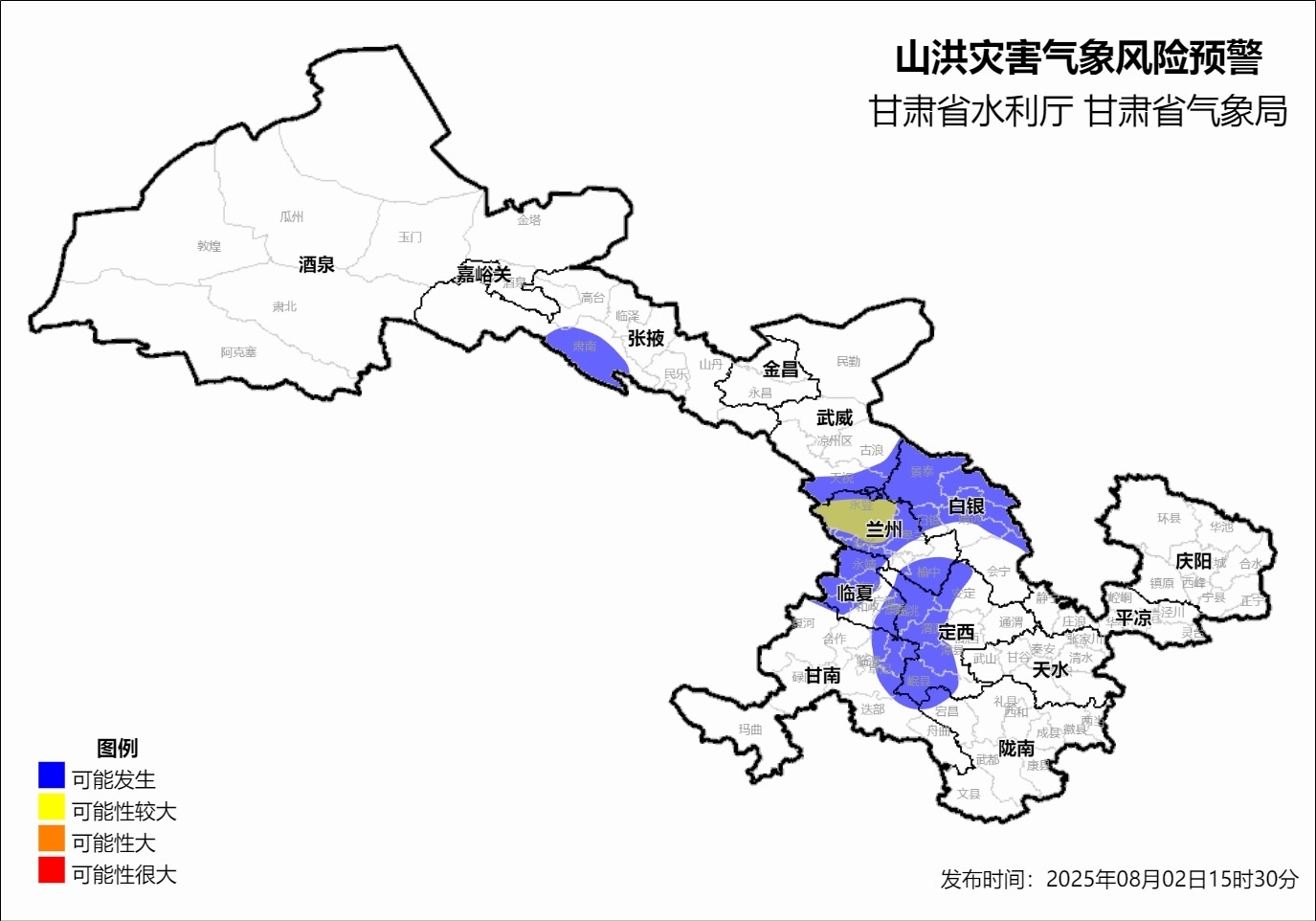 预计,8月2日15时至3日2时兰州市(永登县、兰州新区)等地区发生山洪灾害可能性较大(黄色预警),兰州市(西固区、安宁区、红古区、永登县、皋兰县、兰州新区、七里河区、榆中县)、白银市(白银区、平川区、靖远县、会宁县、景泰县)、武威市(古浪县、天祝县)、定西市(临洮县、安定区、陇西县、渭源县、漳县、岷县)、临夏州(临夏市、临夏县、永靖县、和政县、东乡县、积石山县、康乐县、广河县)、甘南州(夏河县、临潭县、卓尼县、迭部县)陇南市(宕昌县),等地区可能发生山洪灾害(蓝色预警);8月2日17时至2日21时张掖市(肃南县南部、高台县)等地区可能发生山洪灾害(蓝色预警);其他地区也可能因局地短历时强降水引发山洪灾害,请相关部门注意做好实时监测、防汛预警和提请危险区人员转移避险等防范工作,社会公众注意防灾避险。