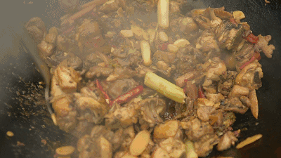 古浪柴火鸡选用肉质紧实,纤维适中的鸡肉,炒制时将整只鸡切成小块,放入油中,加入花椒、胡椒、鲜姜、精盐等佐料翻炒,最后再放入青椒和葱花提味,出锅的鸡肉鲜嫩多汁,每一口都充满了浓郁的香味,让人欲罢不能。