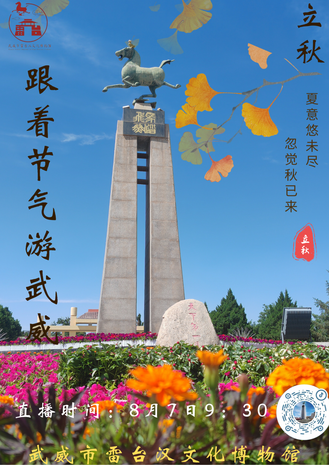 凡转发“武威文体广电旅游”微信公众号平台“跟着节气游武威”立秋节气信息并获赞30个及以上的,8月7日—8月9日凭转发信息点赞量截图,持本人居民身份证,参观雷台汉文化博物馆、文庙景区、天梯山石窟、凉州会盟纪念馆、大云寺景区可享受首道门票免费的优惠政策。