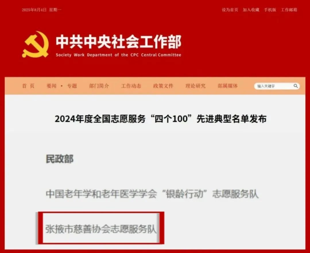 7月31日中央社会工作部发布2024年度全国志愿服务“四个100”先进典型名单,张掖市慈善协会志愿服务队荣耀上榜。张掖市慈善协会志愿服务队自2018年成立以来,116名志愿者秉持“奉献、友爱、互助、进步”精神,活跃在城市各个角落,90%以上的高参与率,使其成为张掖公益的中流砥柱,赢得社会各界的广泛赞誉,用实际行动书写着这座城市的温暖篇章。