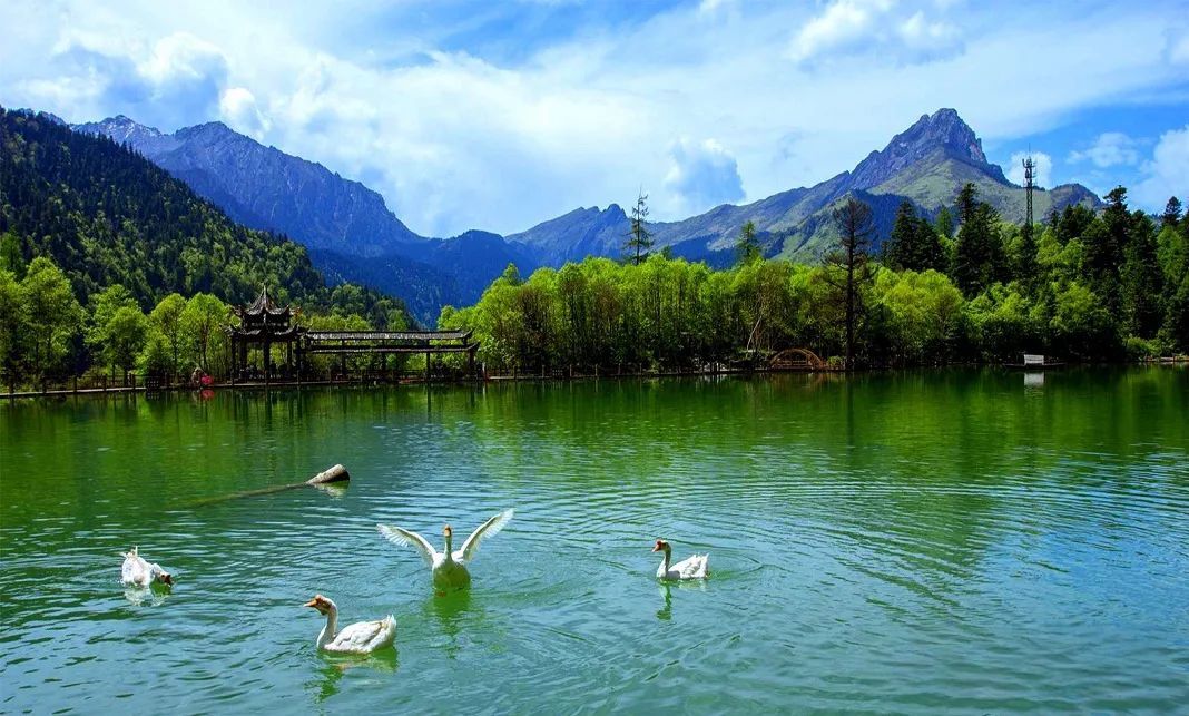 下午:探秘原始森林登顶泽荡措,在海拔3000米的高山湖泊边,看碧波倒映雷古雪山,偶有白鹅翩跹游过水面。